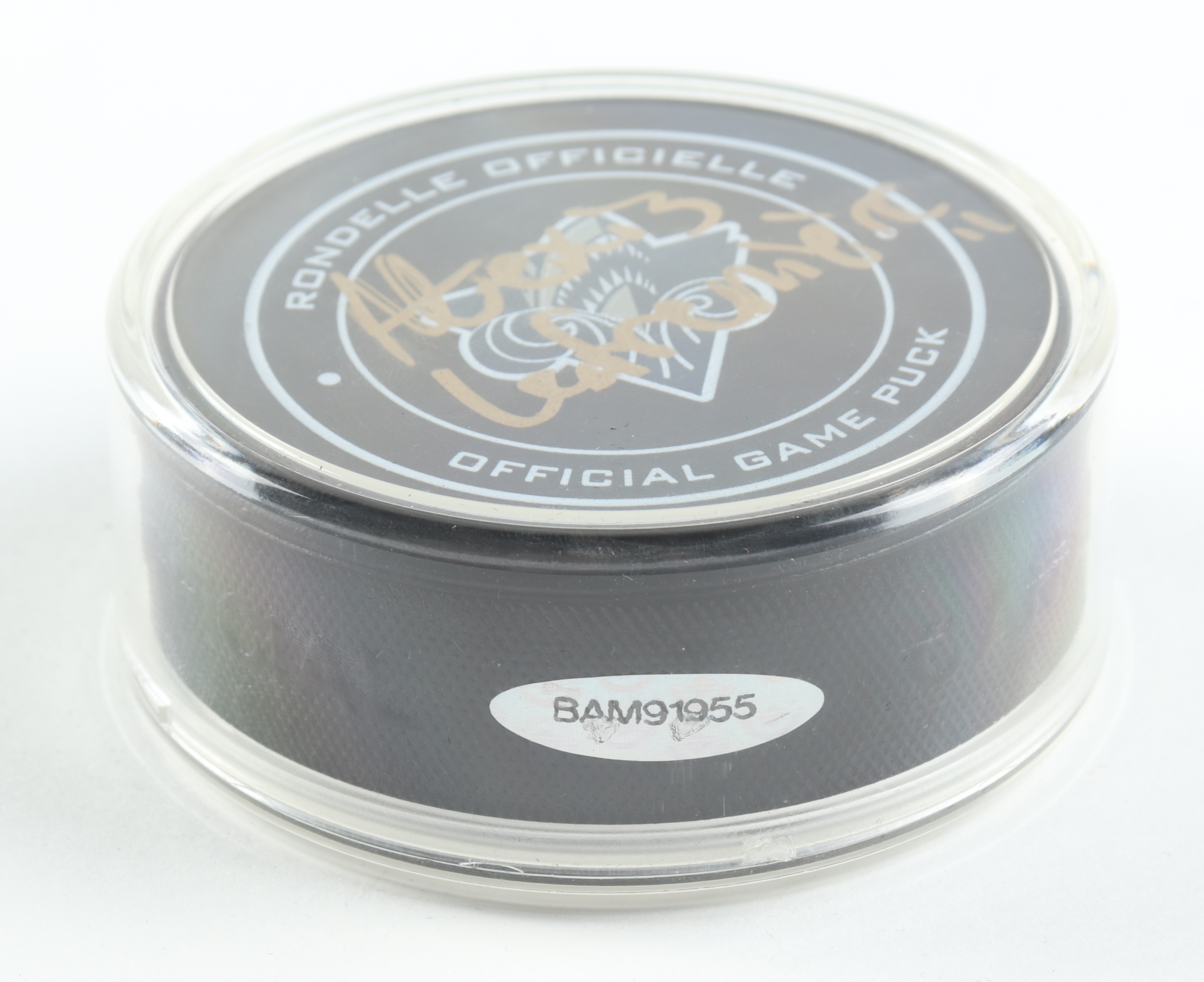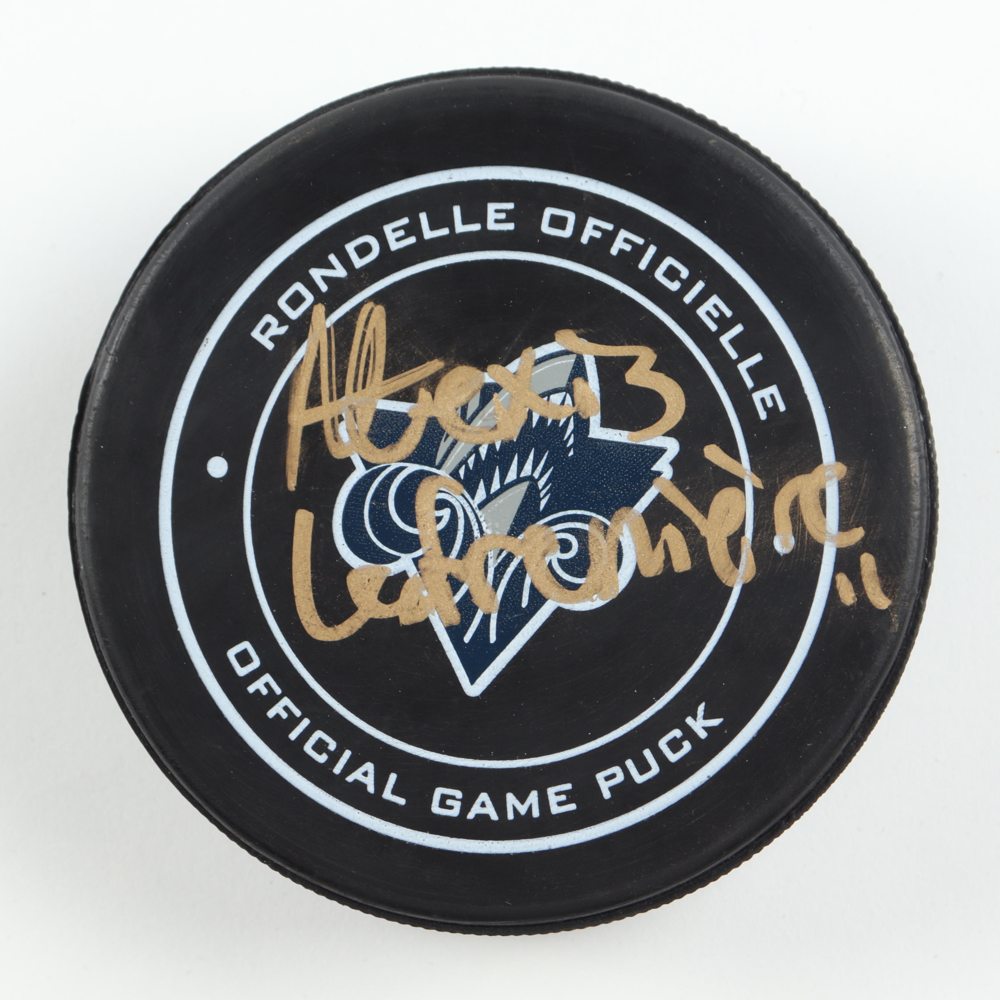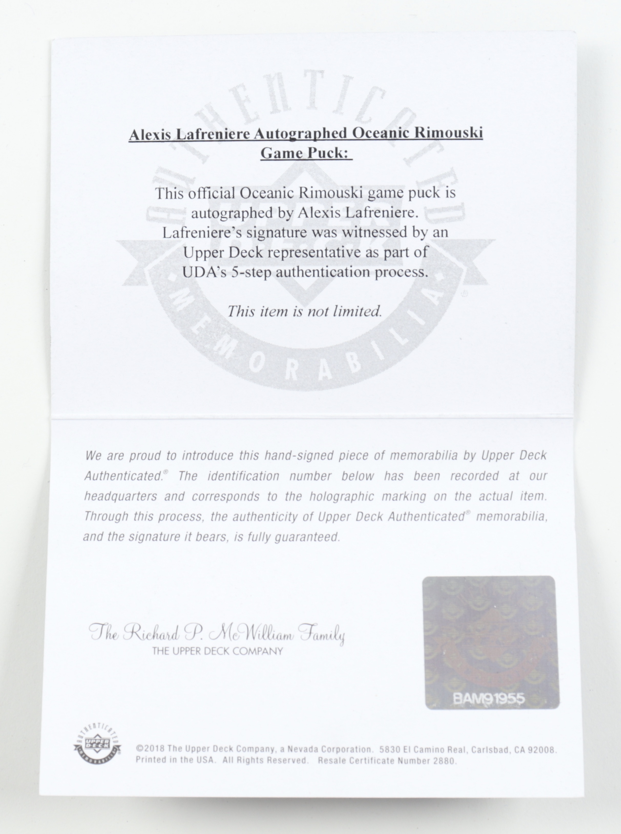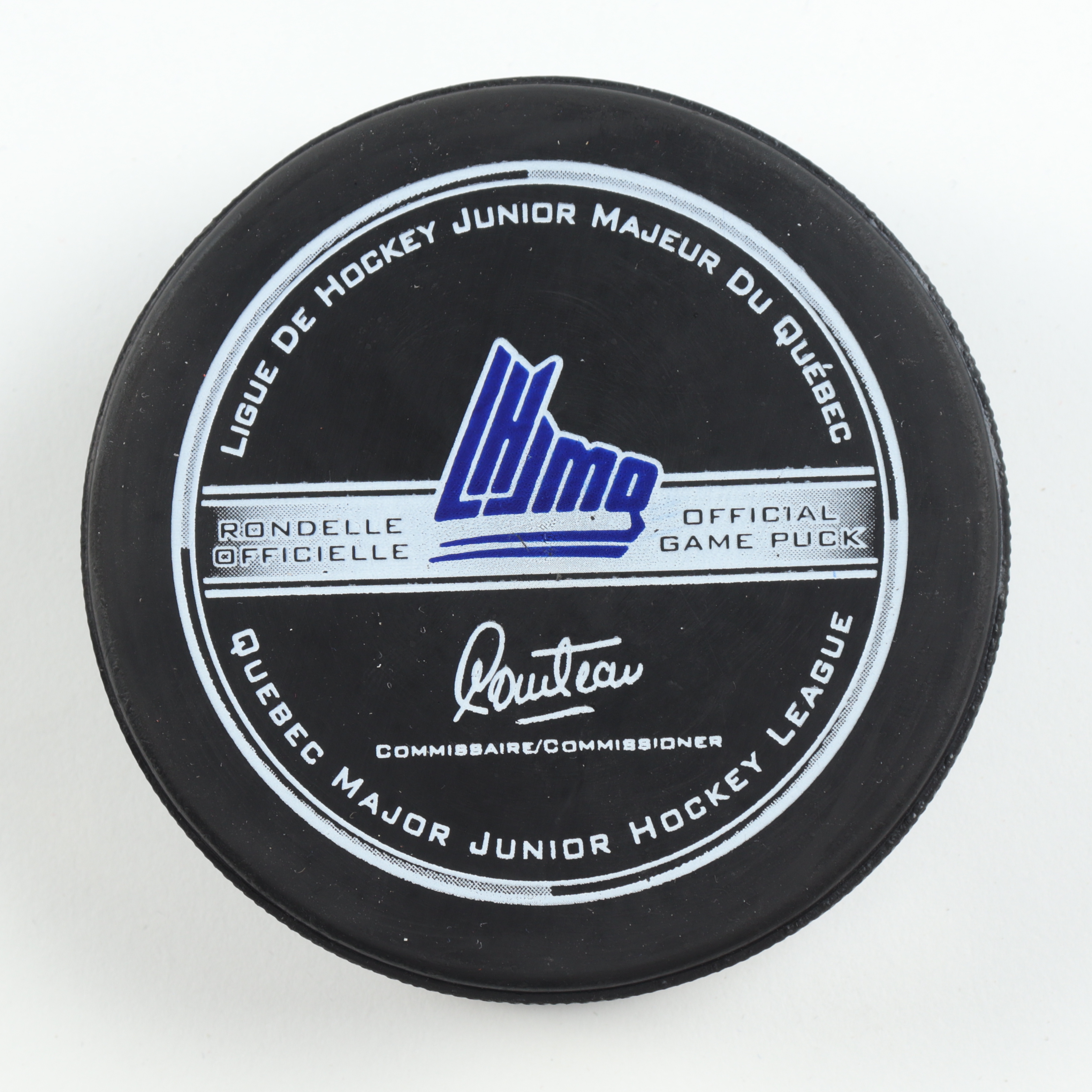 Rimouski Océanic logo hockey puck has been hand-signed by Alexis Lafreniere. Includes casing and box as shown.