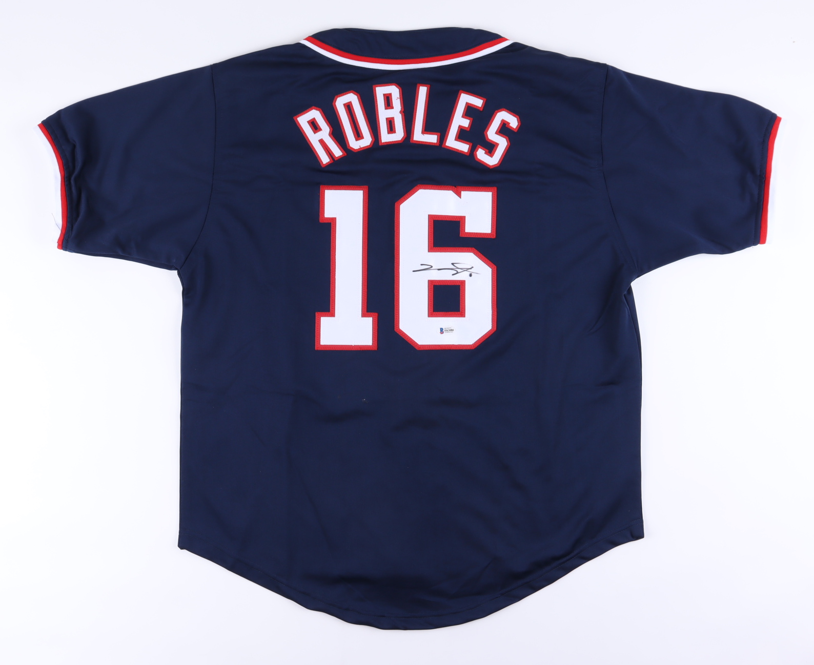 Custom on-field style jersey. Everything is sewn on, size XL. Has been hand-signed by Victor Robles. Please note, minor staining on reverse side of jersey and stitching imperfections on the number.