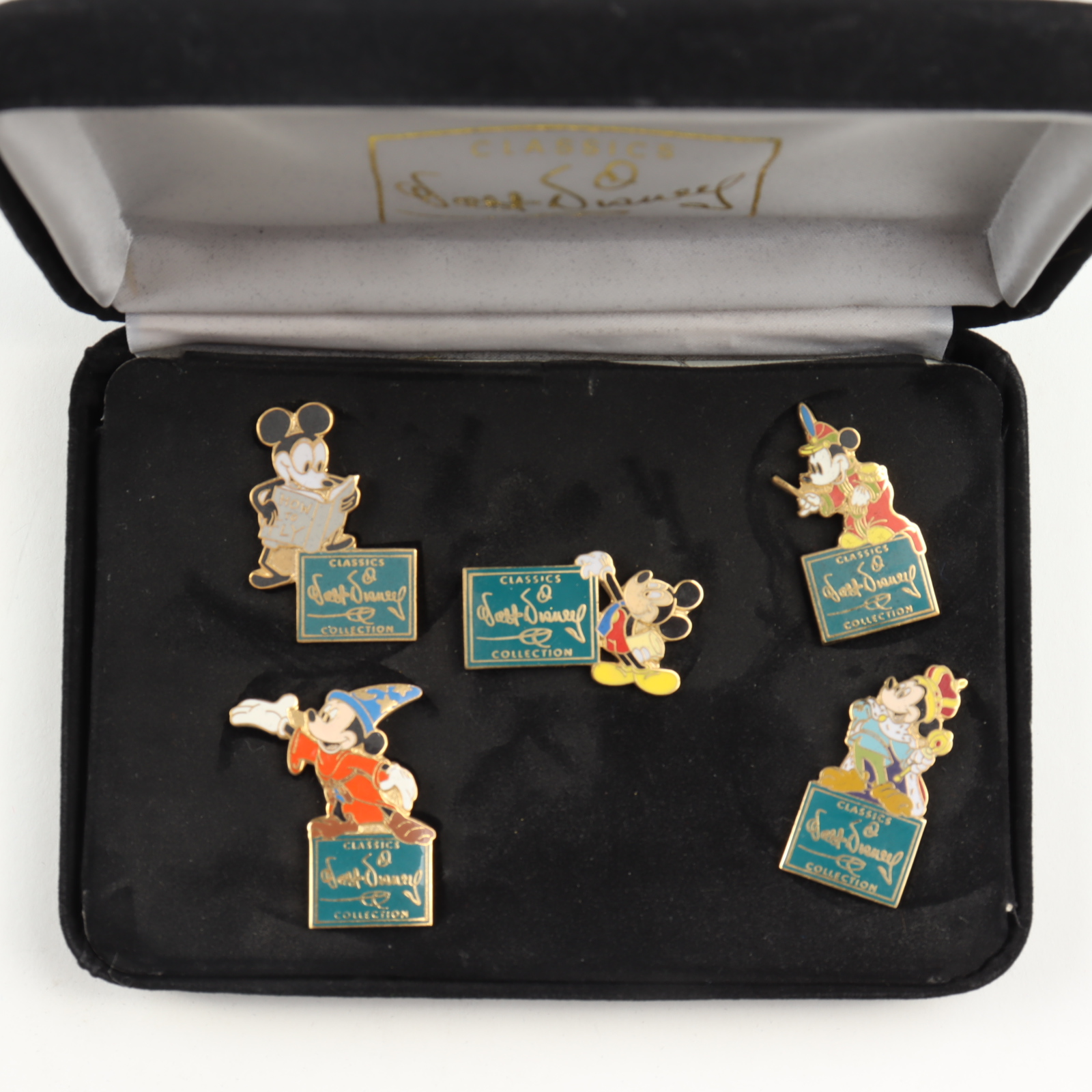 Set includes all (5) Vintage Walt Disney Classics Collection pins as well as the case as shown. Please see images regarding the details of the pins.