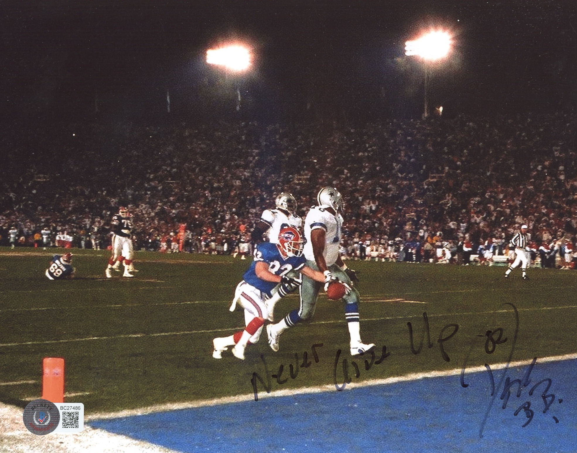 Don Beebe Signed Bills 8x10 Photo Inscribed "Never Give Up" (Beckett COA)