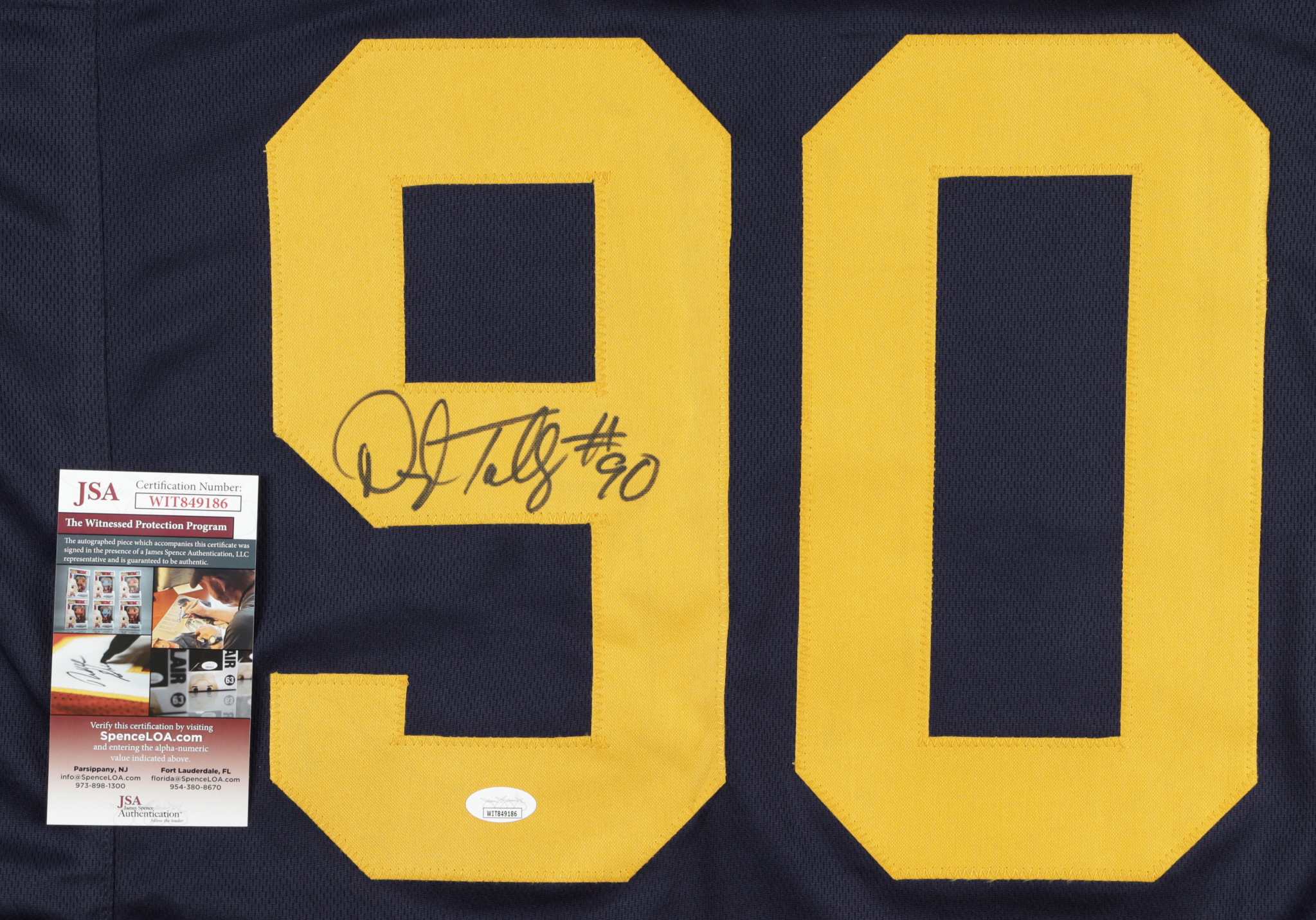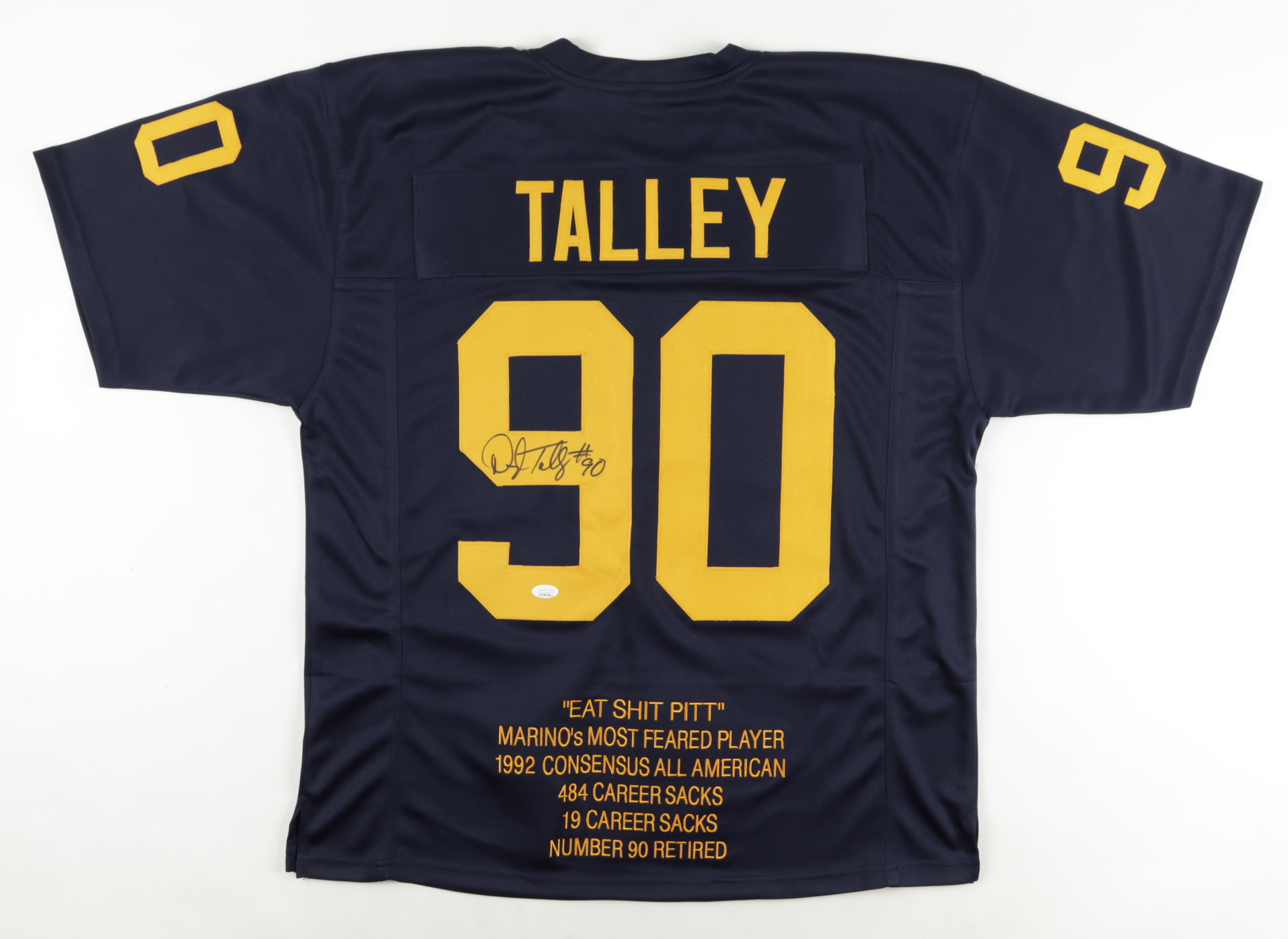Custom on-field style jersey. Everything is sewn on, size XL. Hand-signed by Darryl Talley. Talley's career stats are custom stitched onto the jersey below the reverse numbers.