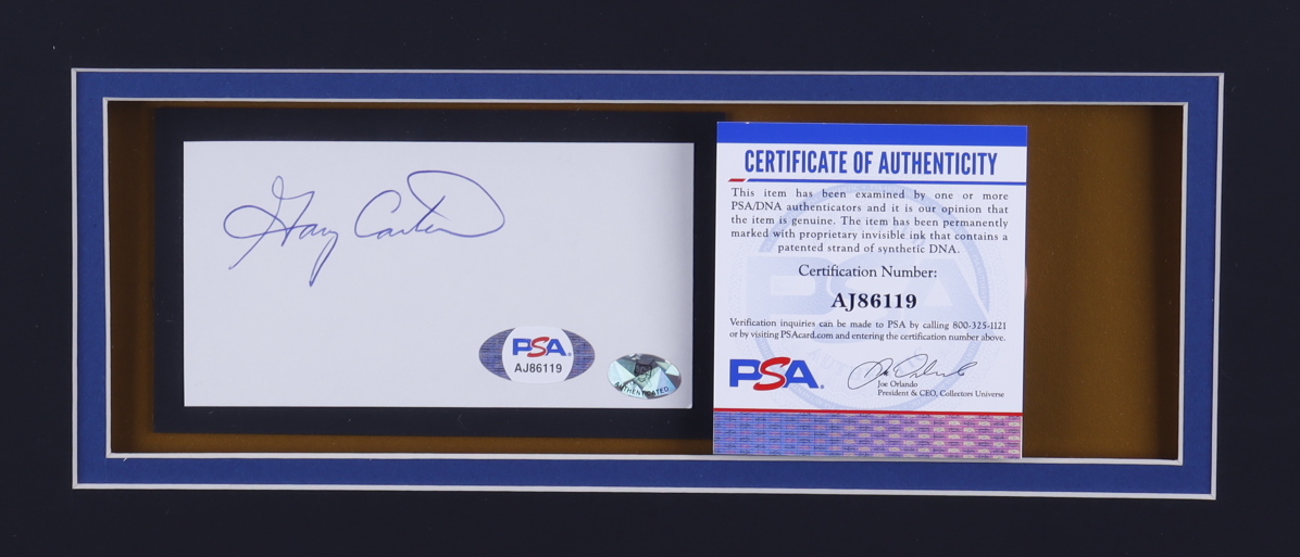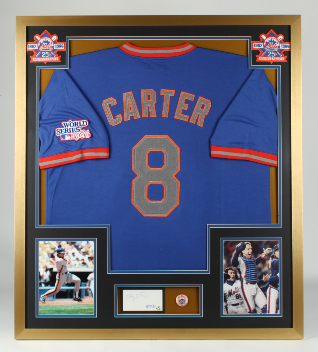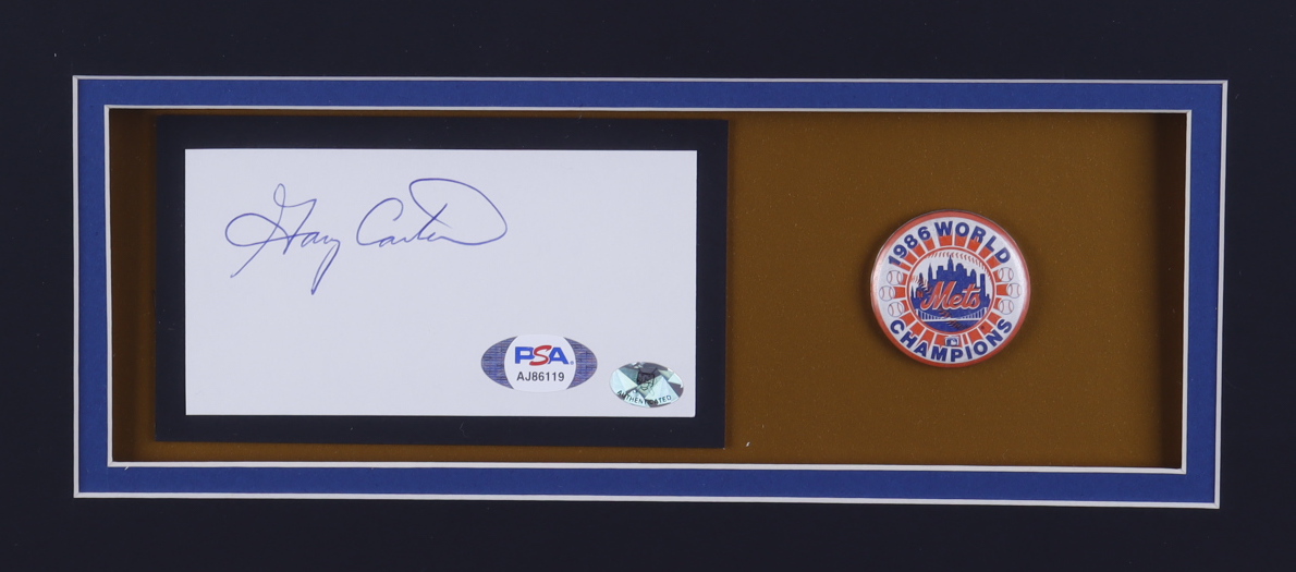 Custom framed display measures approximately 32" x 36" in size. Display includes a cut that has been hand-signed by Gary Carter (D. 2012, HOF). Display also features (2) 8" x 10" photos, a 1986 World Champions pin, and a Gary Carter jersey.