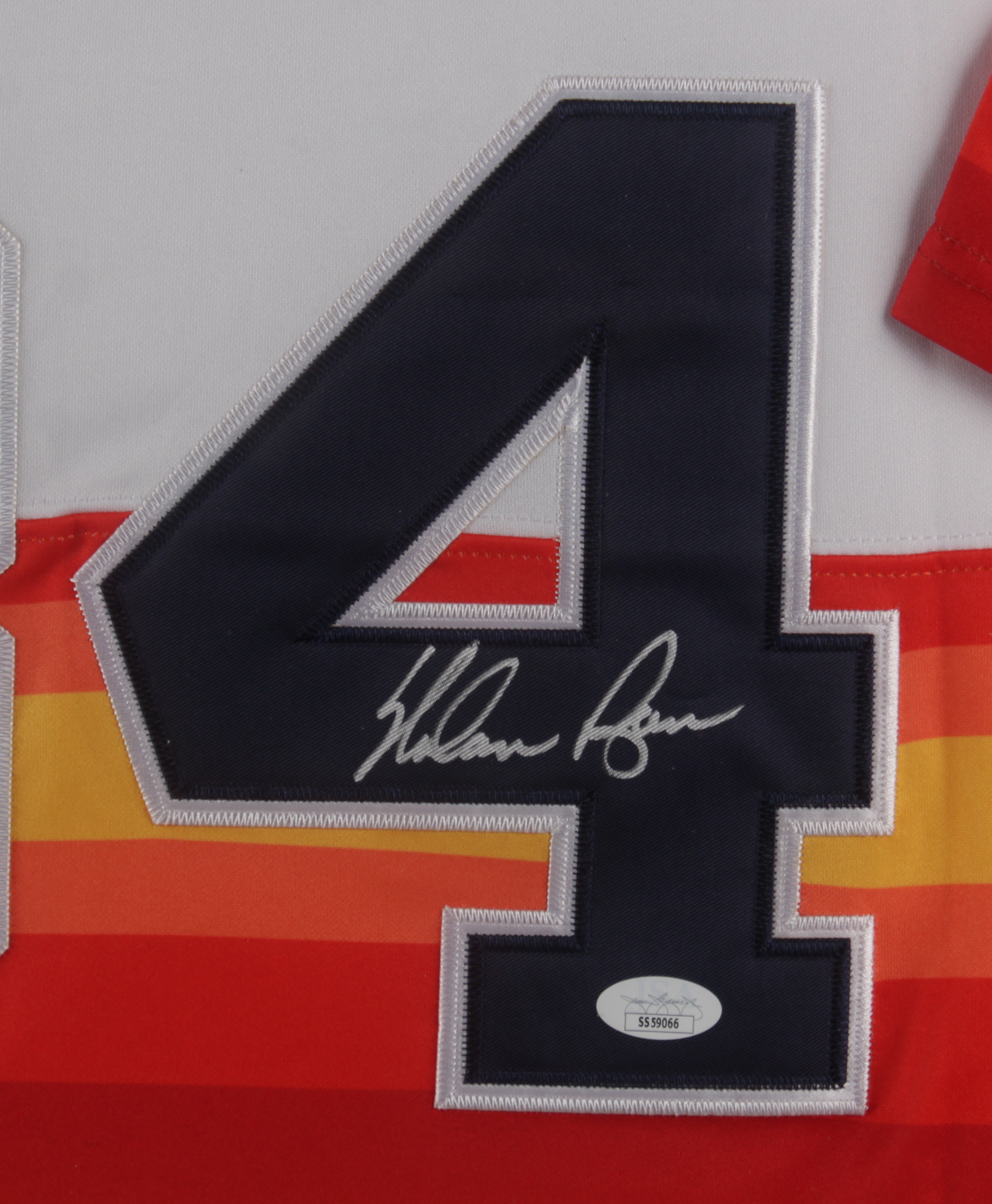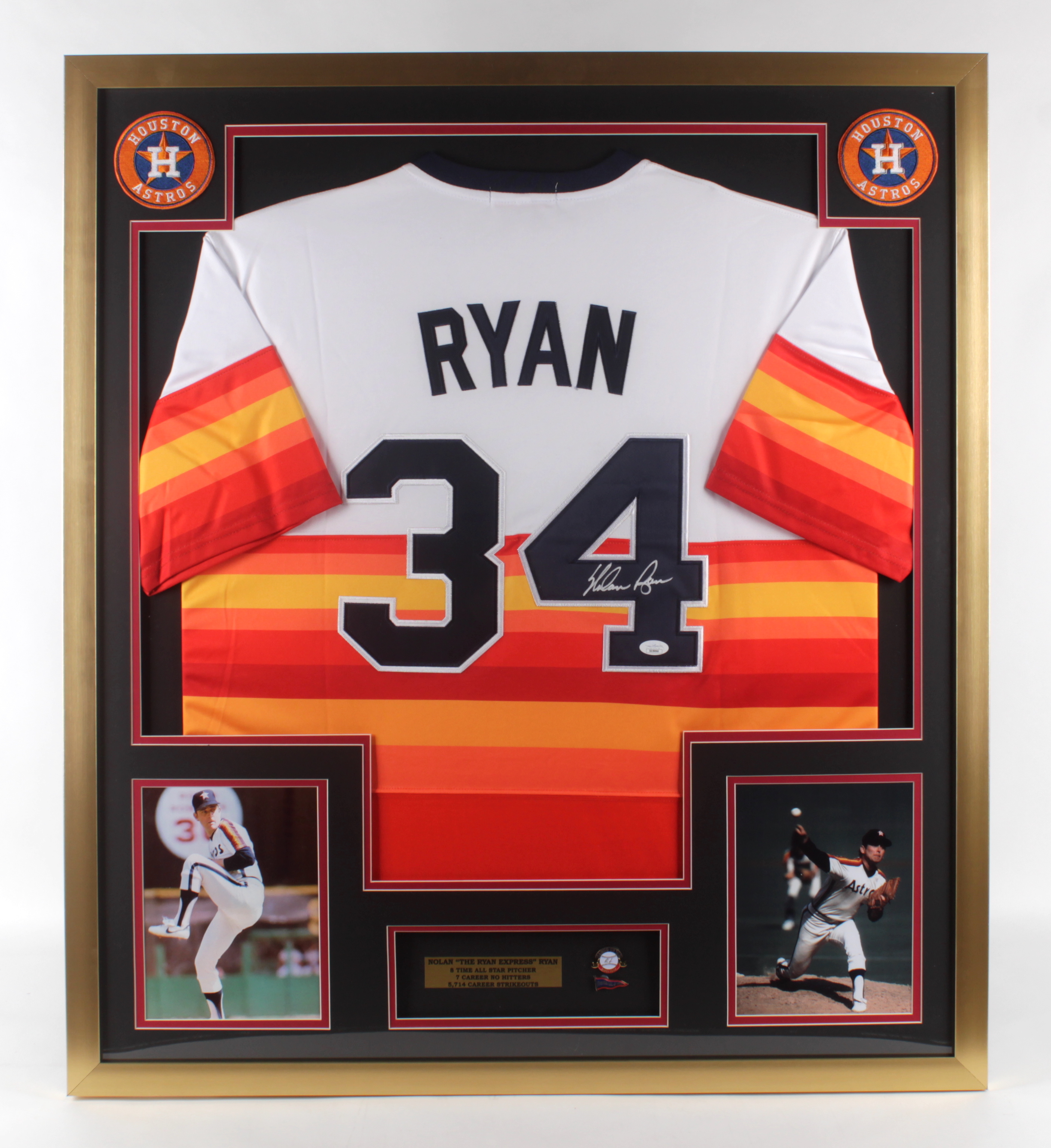 Custom frame measures 32" x 36" in size and features a jersey that has been hand-signed by Nolan Ryan (HOF). Display also features (2) 8" x 10" photos and (2) HOF induction pins.