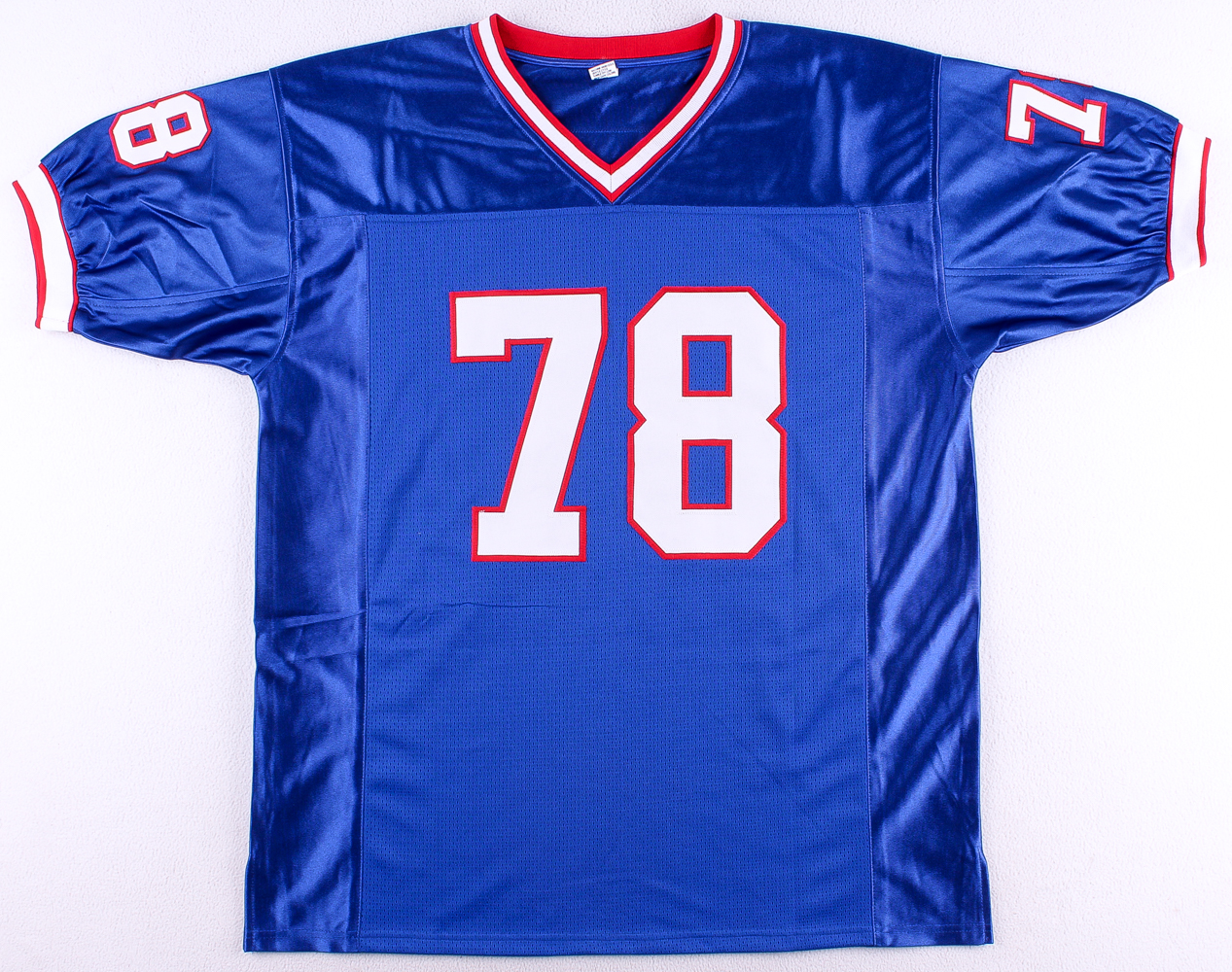 Custom on-field style jersey. Everything is sewn on, size XL. Hand-signed in black felt tip pen by Bruce Smith (Redskins, HOF).