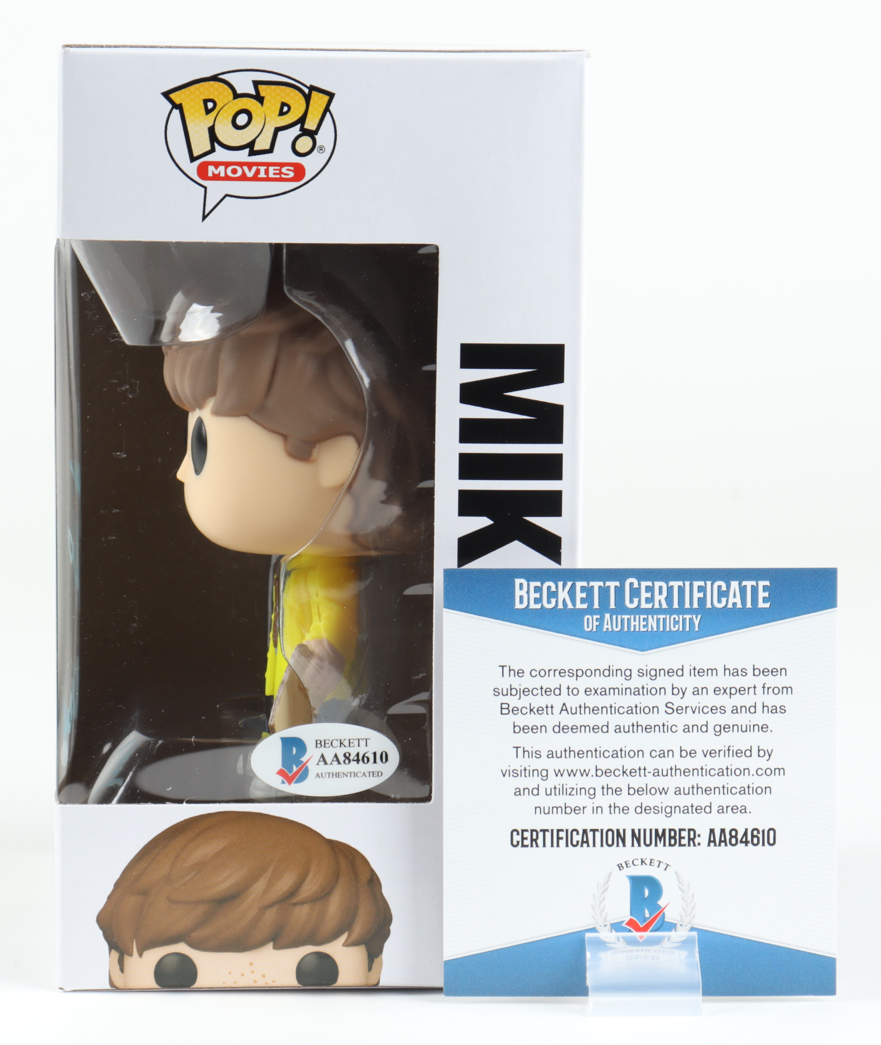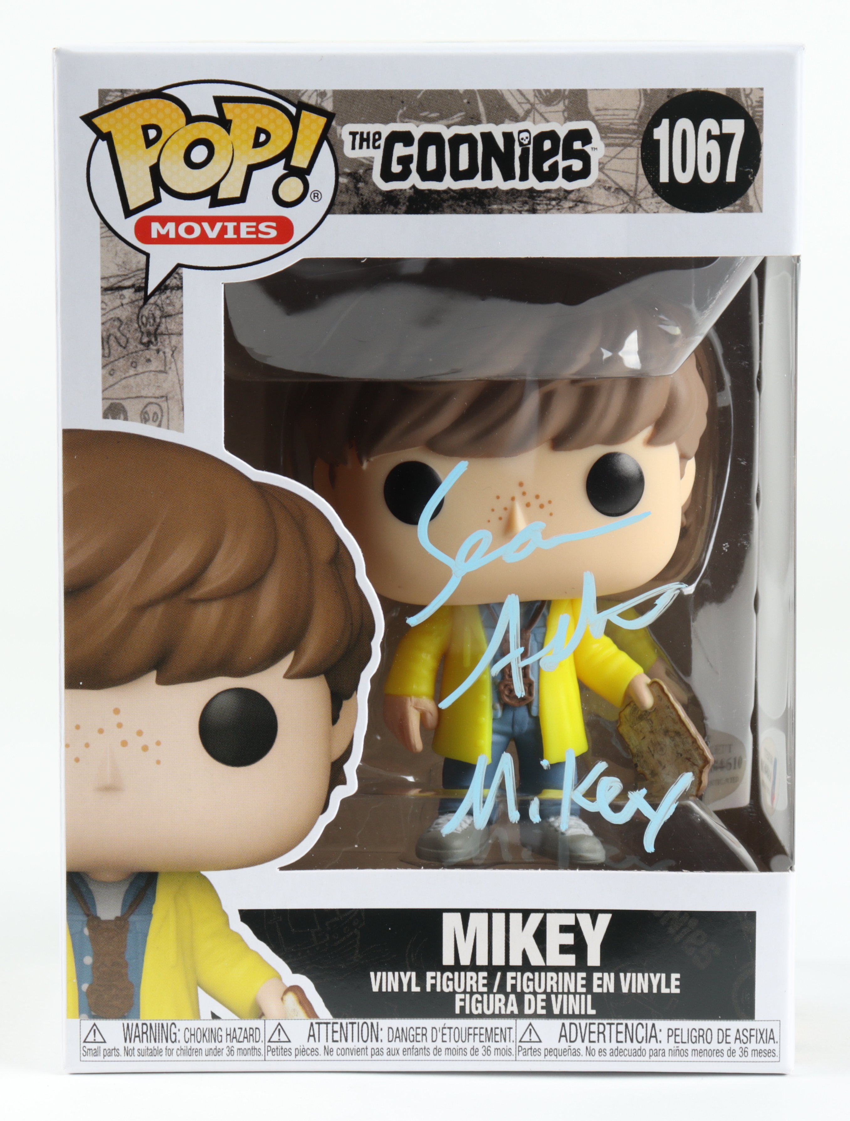 Funko Pop! figure measures approximately 4" tall. Hand-signed and inscribed on the packaging by Sean Astin (Mikey Walsh).