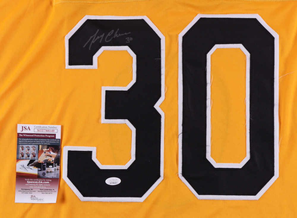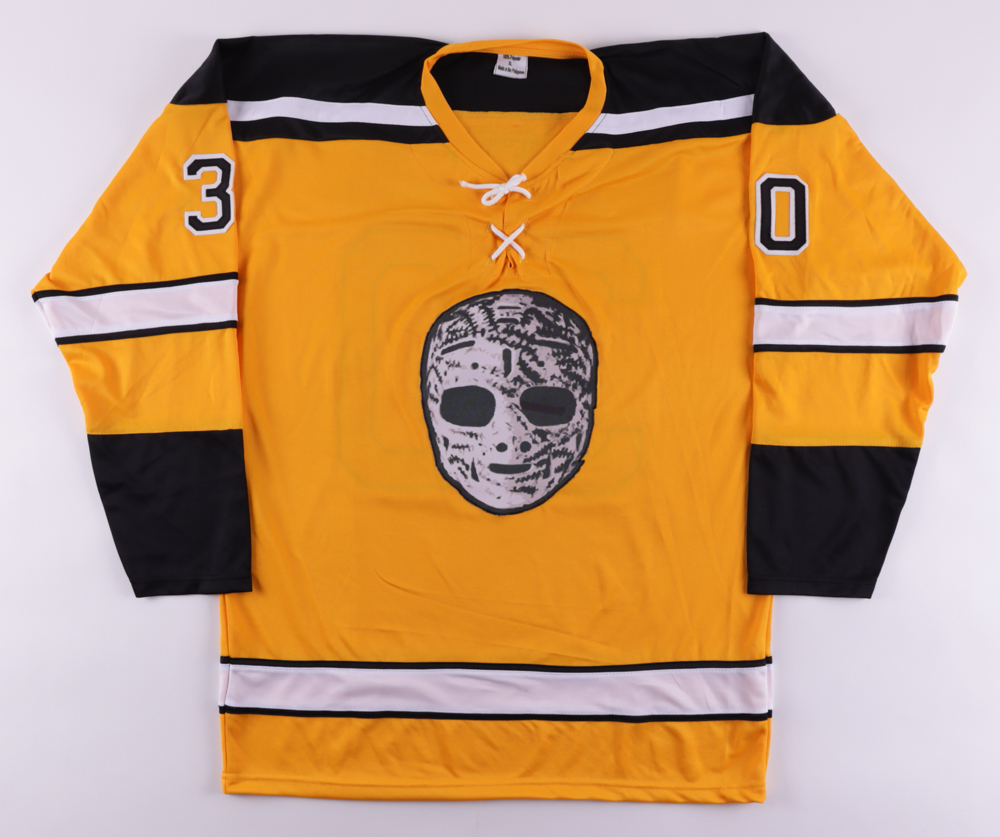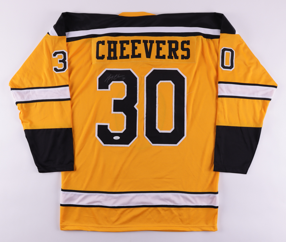 Custom on-ice style jersey. Everything is sewn on, size XL. Hand-signed by Gerry Cheevers (HOF).