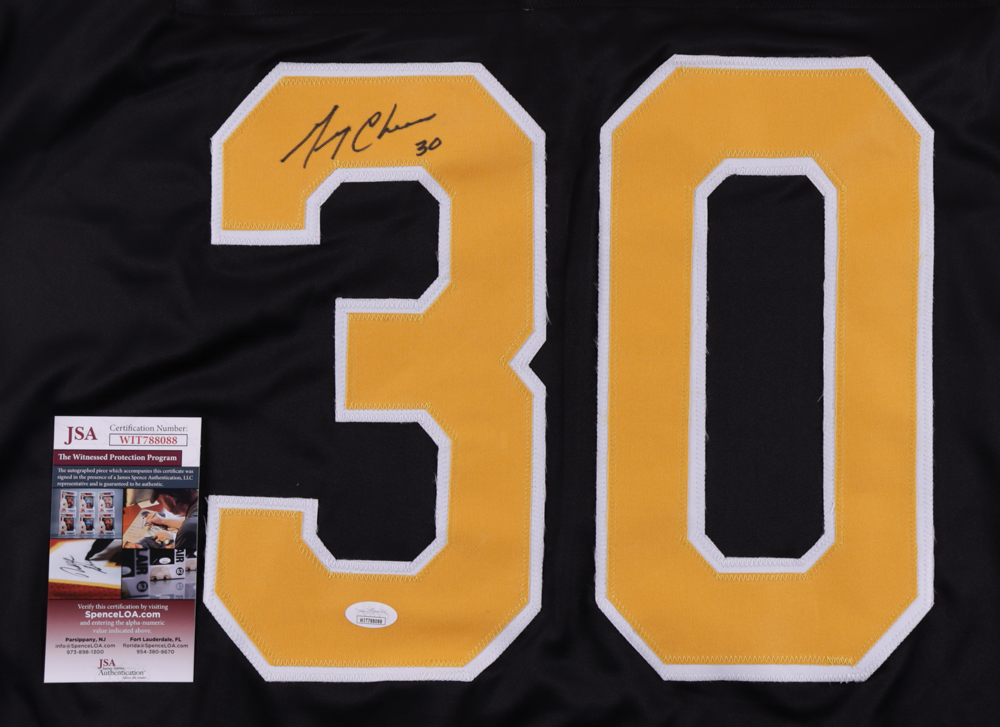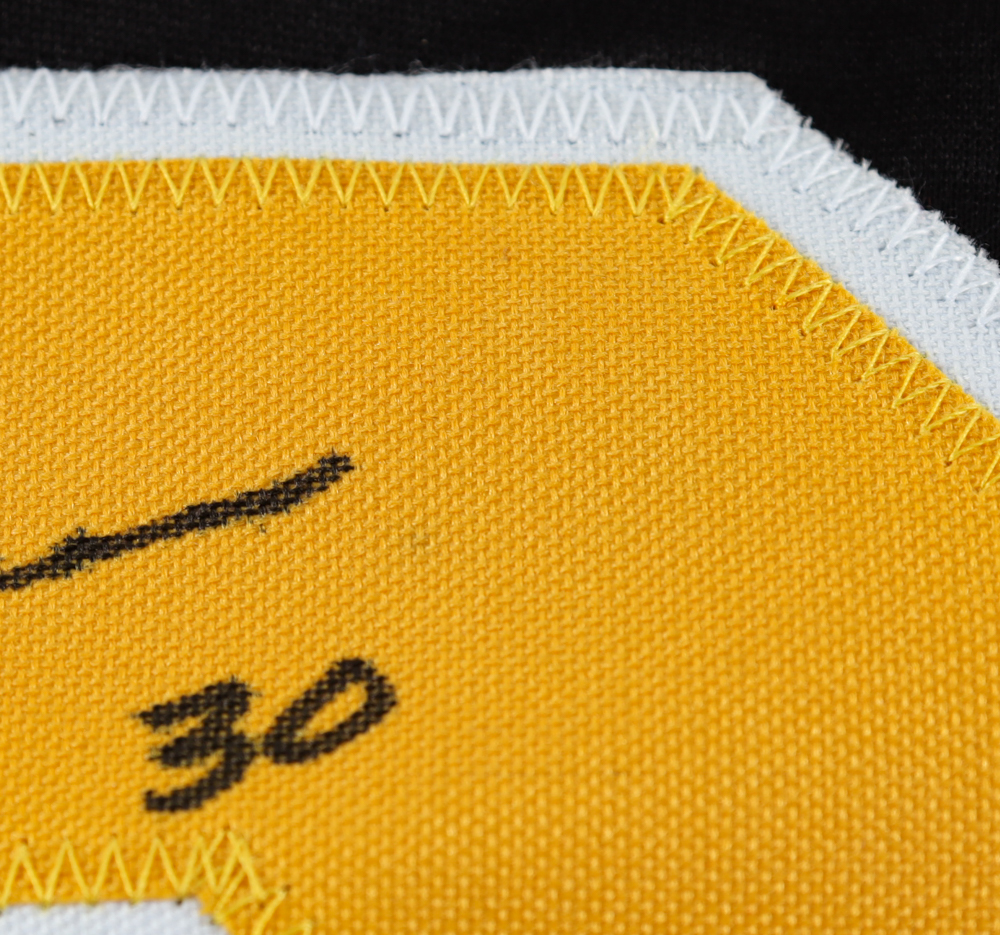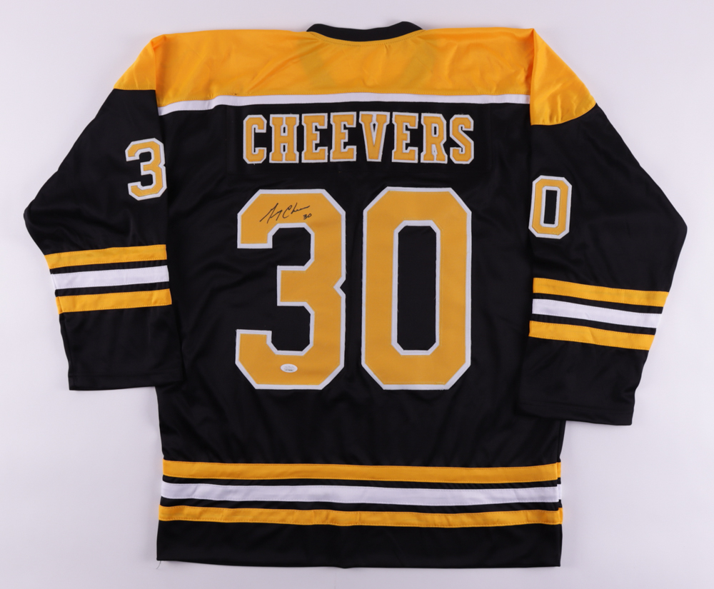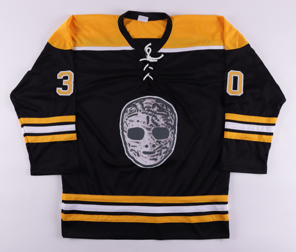 Custom on-ice style jersey. Everything is sewn on, size XL. Hand-signed by Gerry Cheevers (HOF). Please note, there is a slight stain next to the autograph.