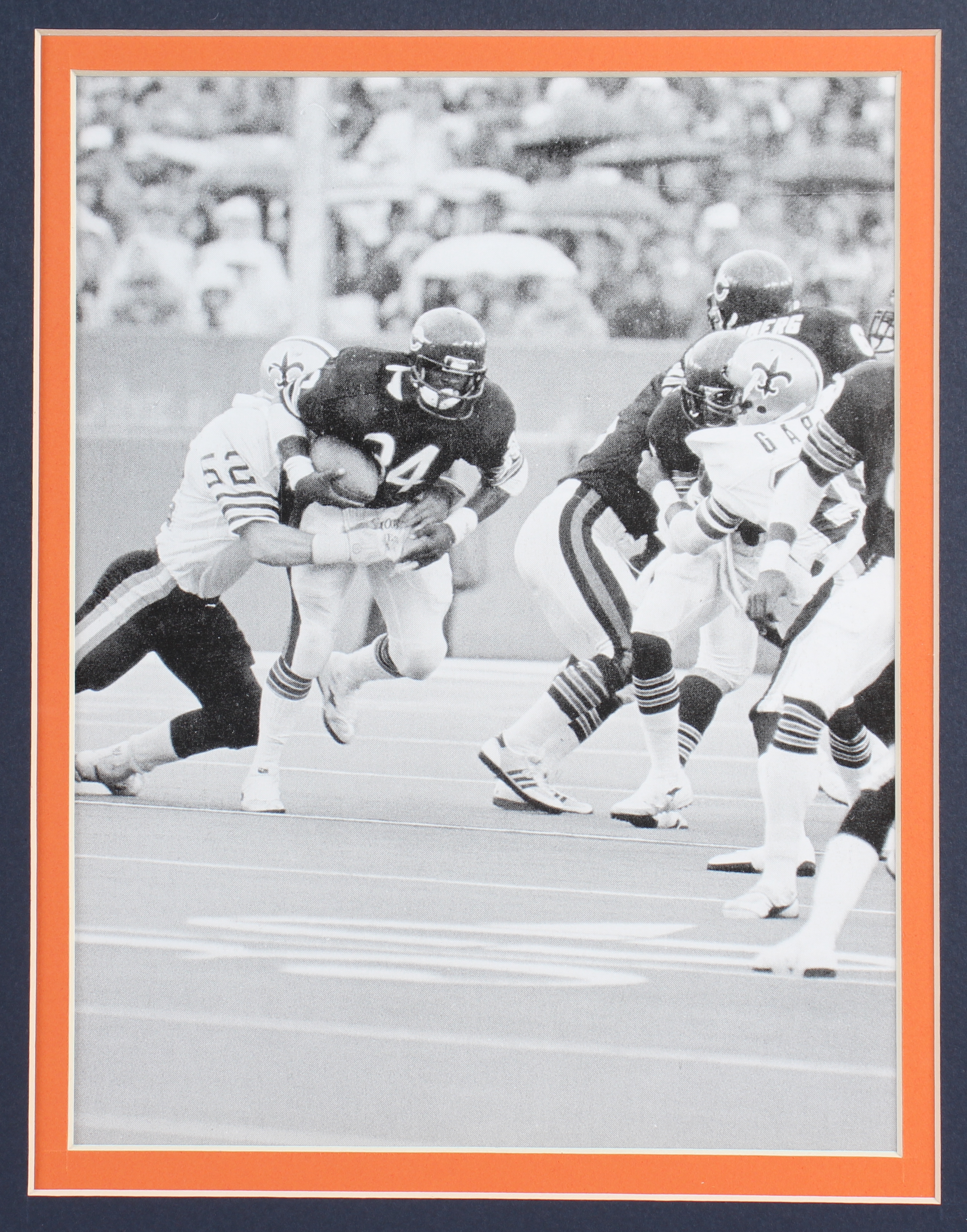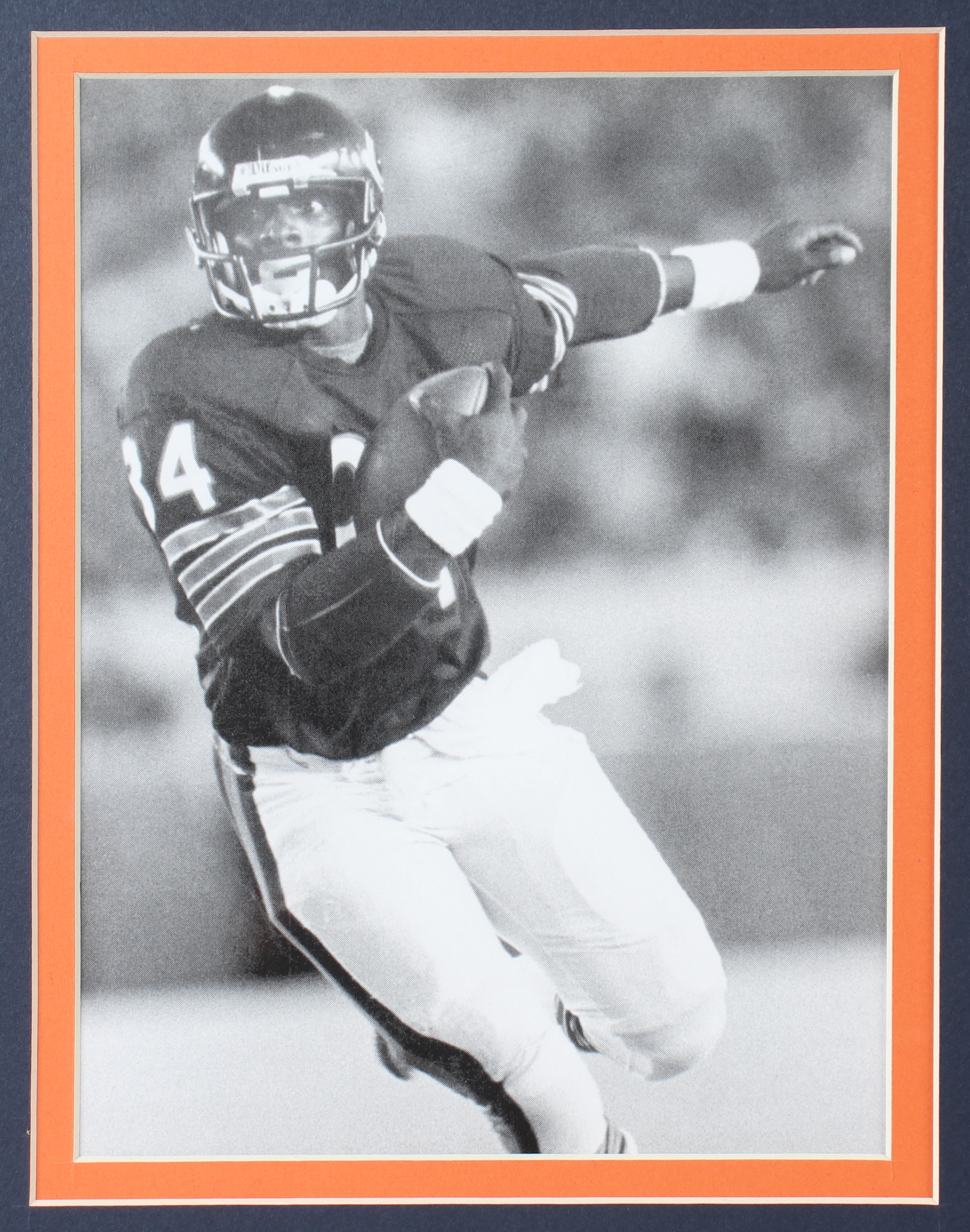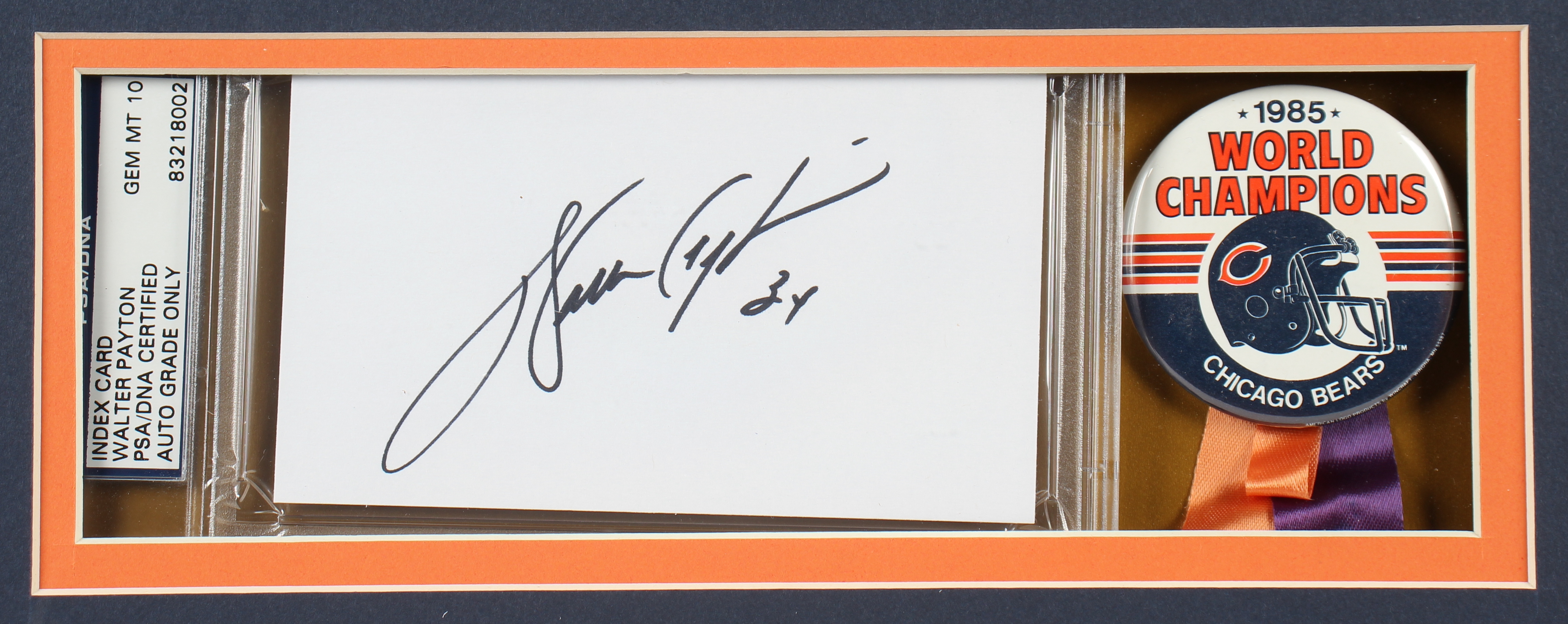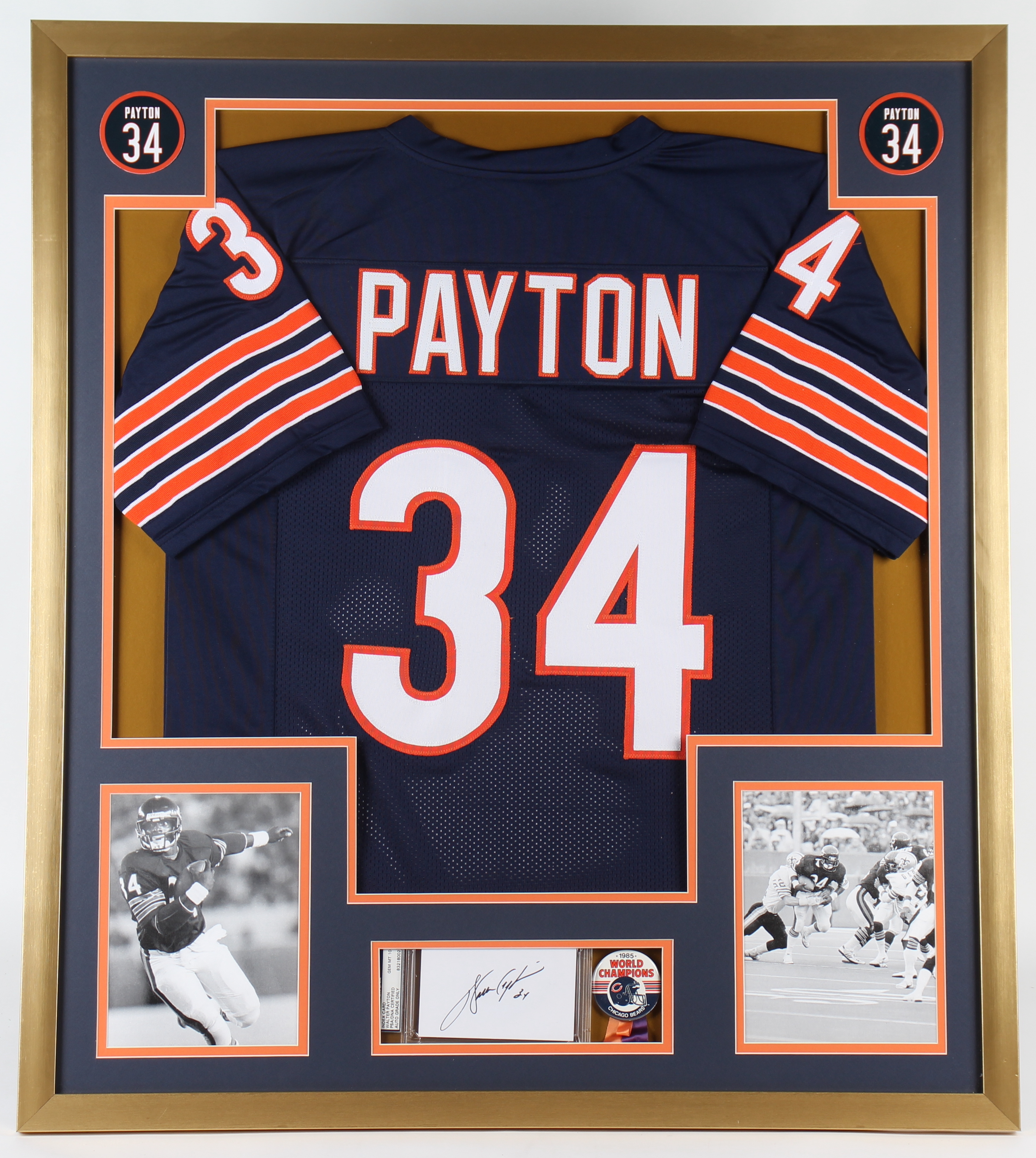 Custom framed display measures approximately 32" x 36" in size. Display includes an Index Card that has been hand-signed by Walter Payton (D. 1999, Chicago Bears, HOF). Display also features (2) 8" x 10" photos, a Super Bowl XX Champs pin, and a Walter Payton jersey.