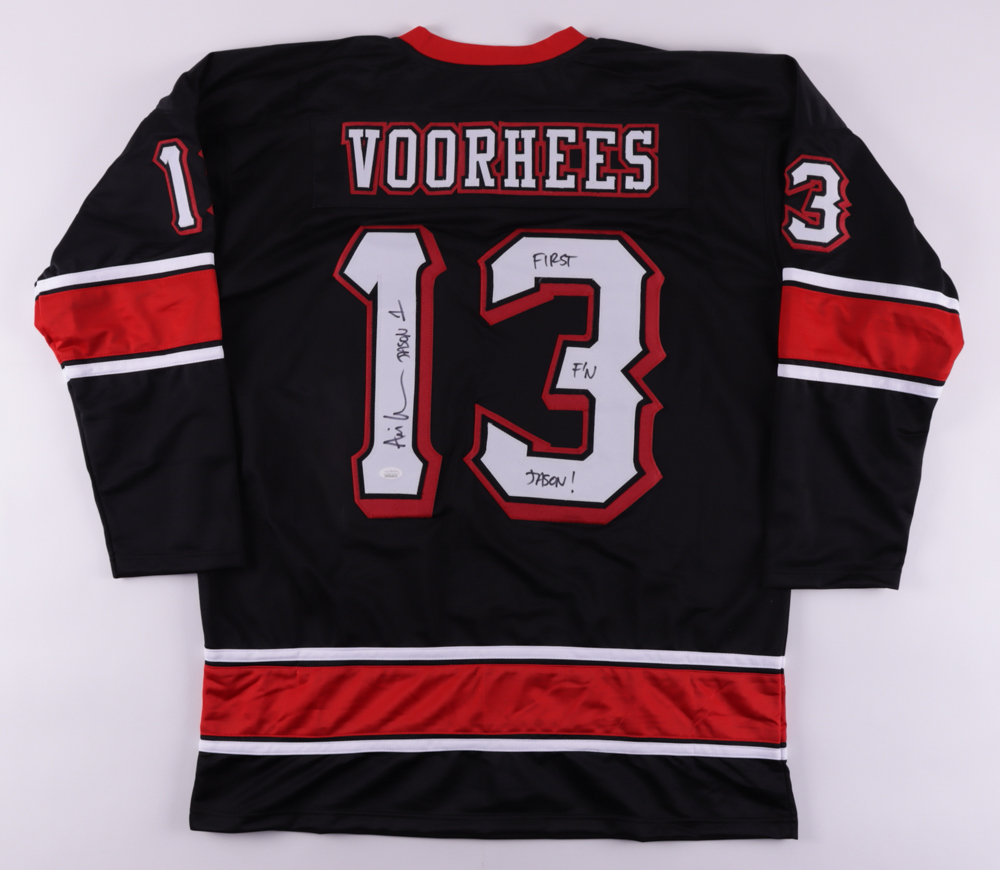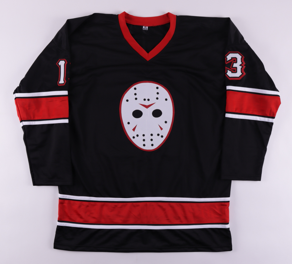 Custom on-ice style jersey. Everything is sewn on, size XL. Hand-signed and inscribed by Ari Lehman (Jason Voorhees).