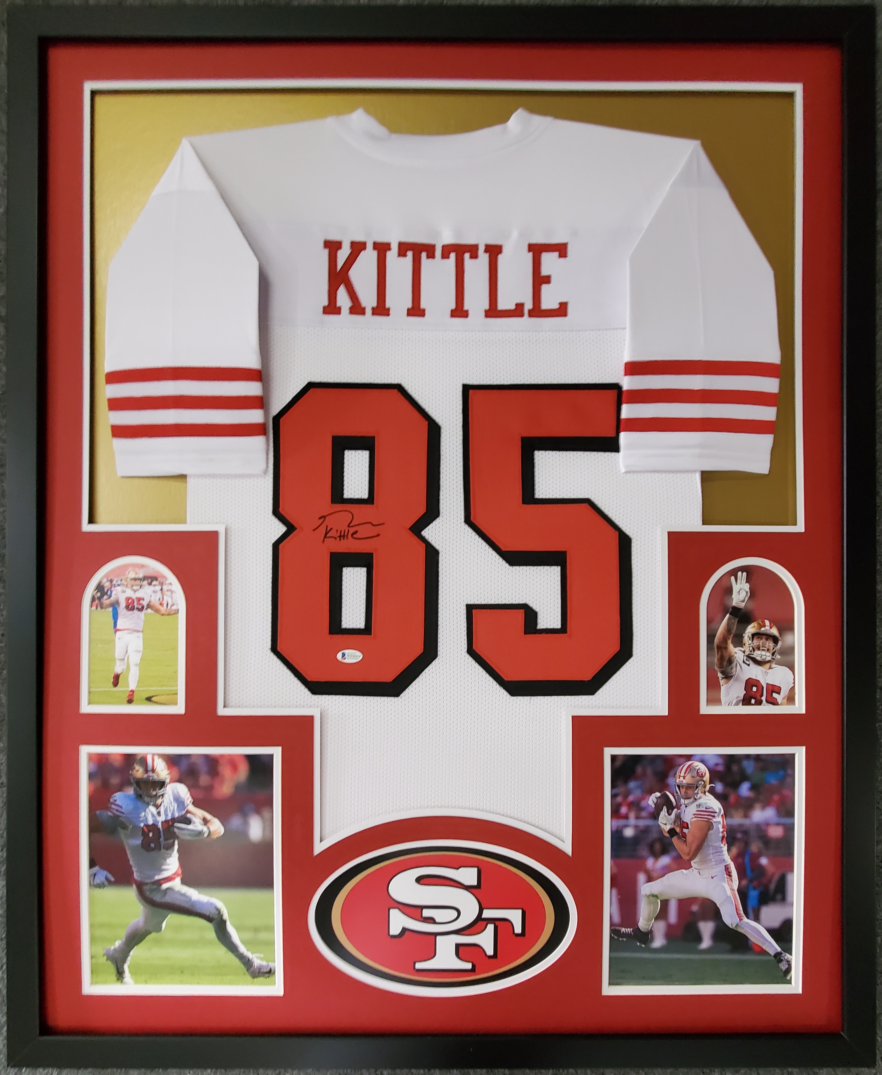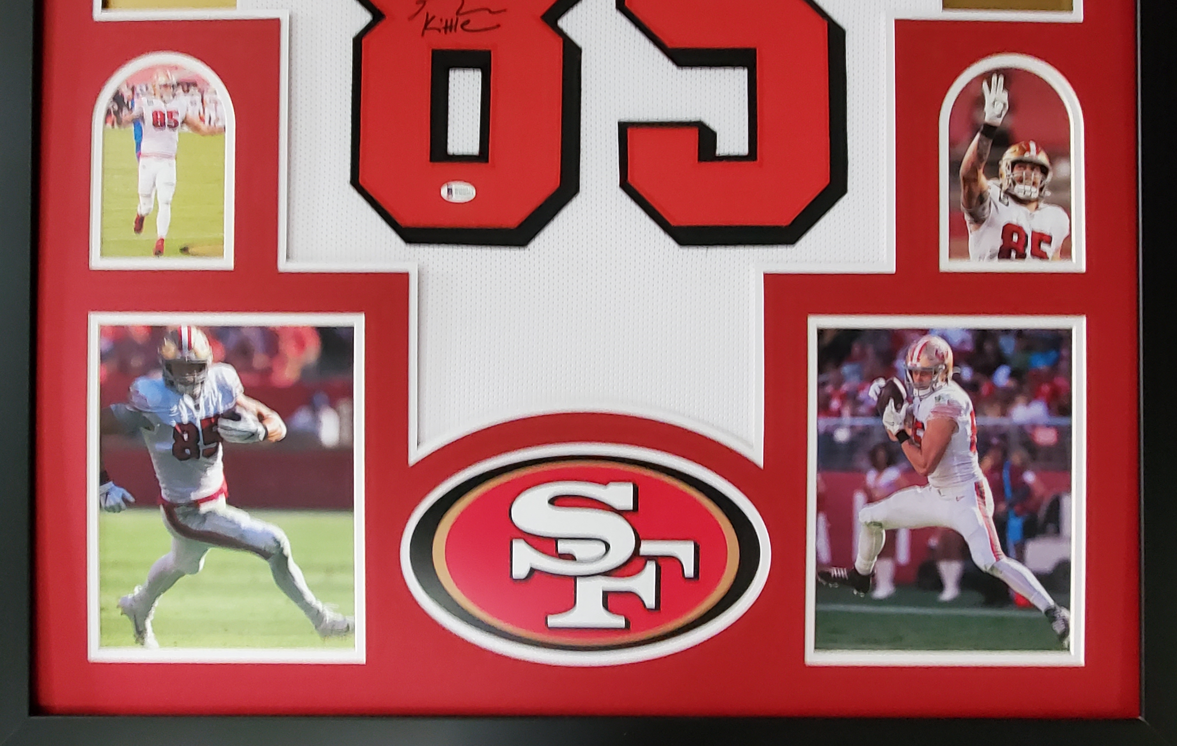 Custom framed display measures 34" x 42" in size and features a jersey that has been hand-signed by George Kittle (San Francisco 49ers).