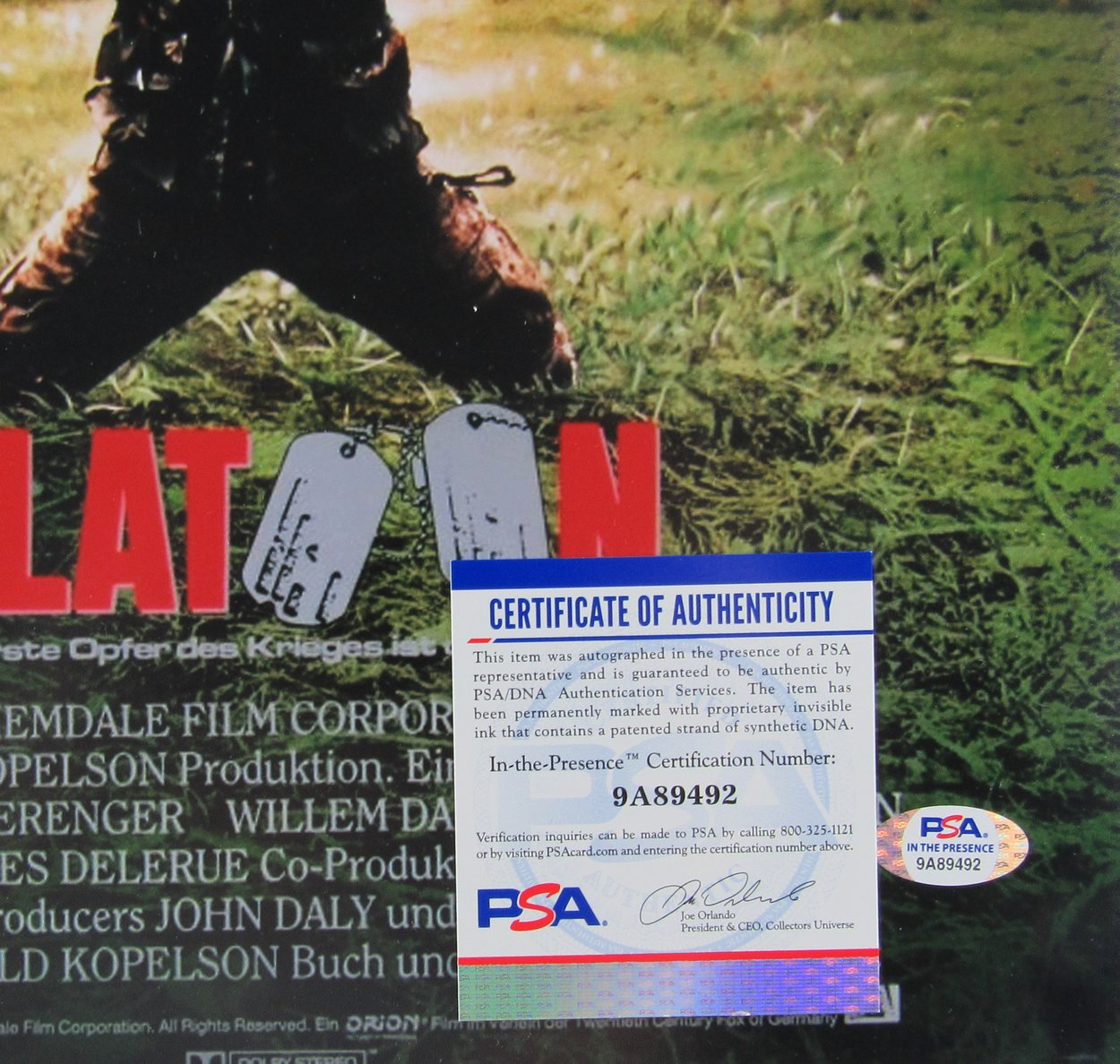 Photo measures 11" x 14" in size and has been hand-signed by Charlie Sheen (Pvt. Chris Taylor).