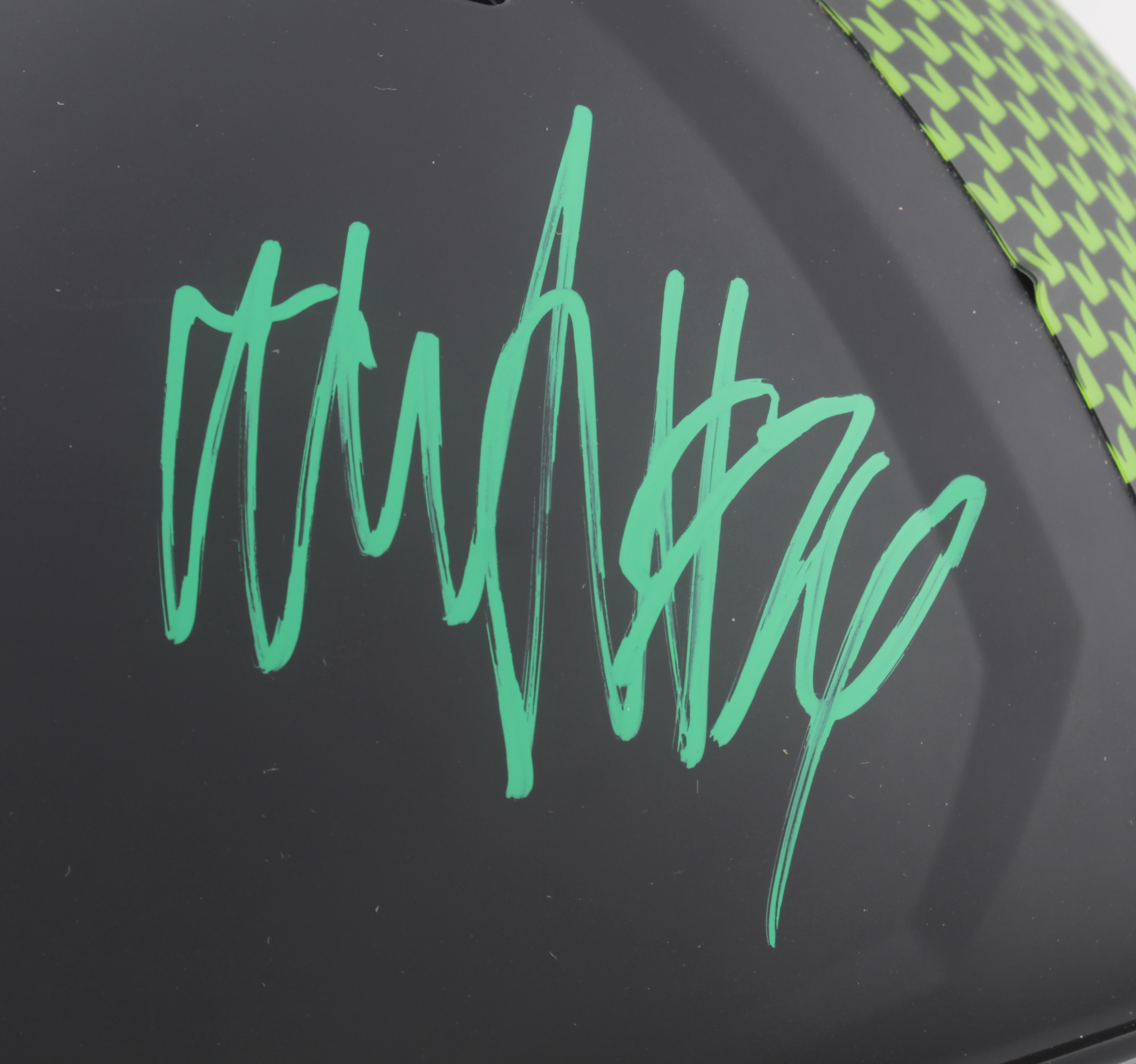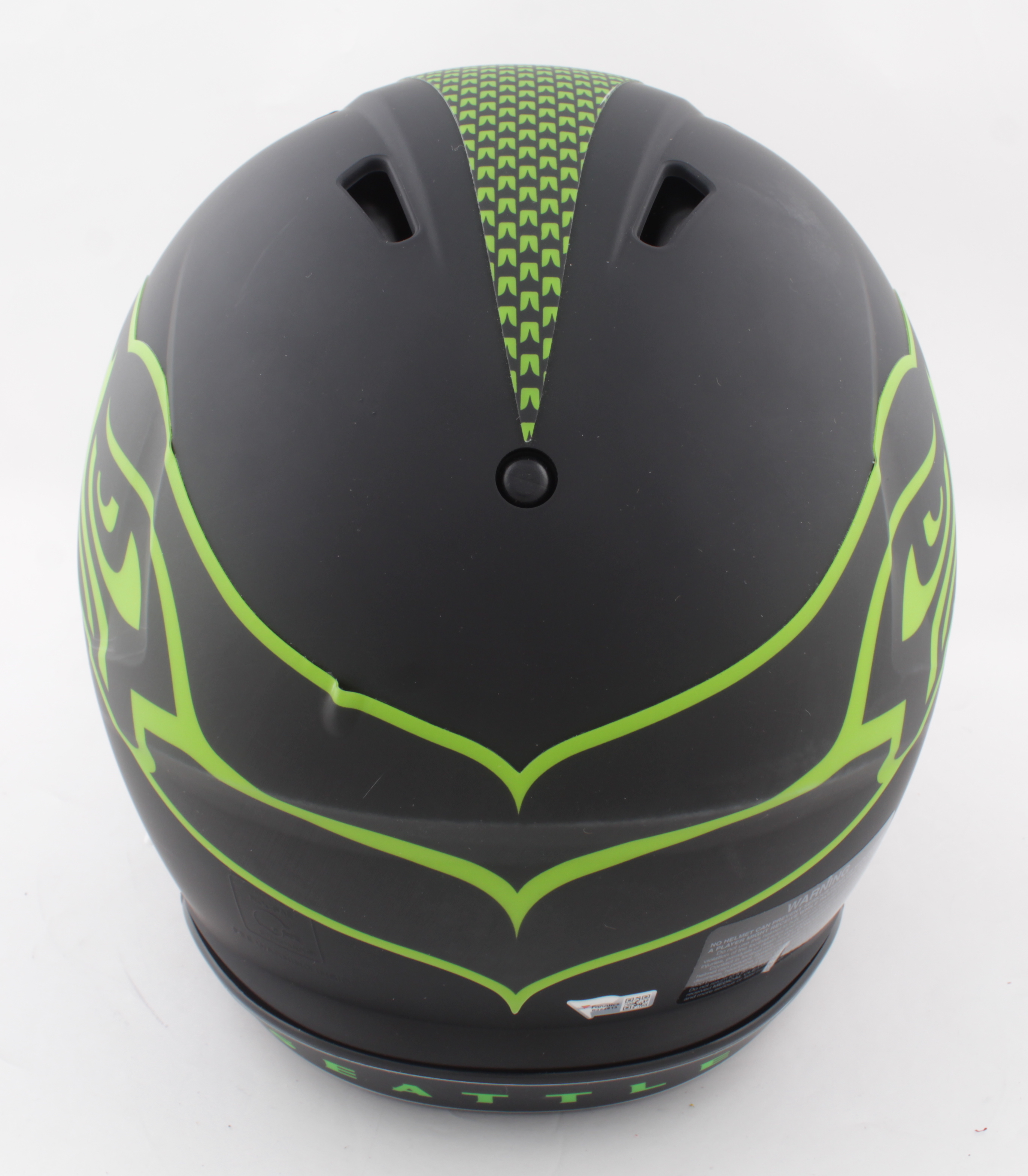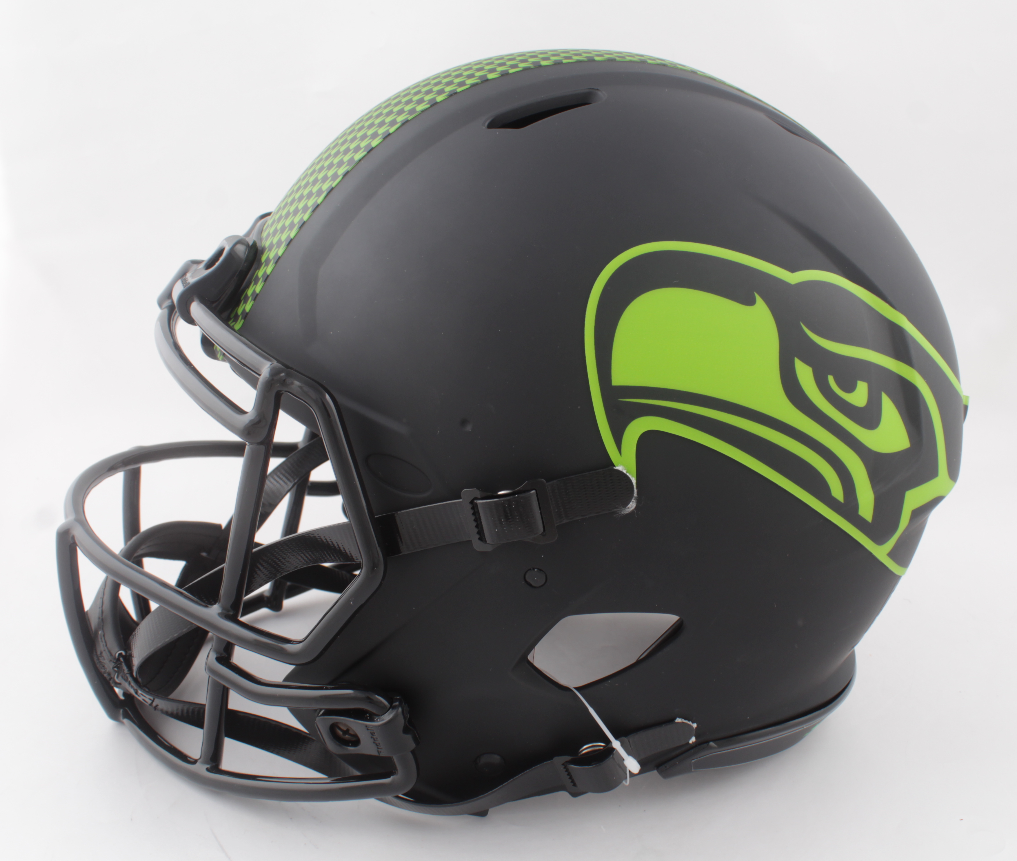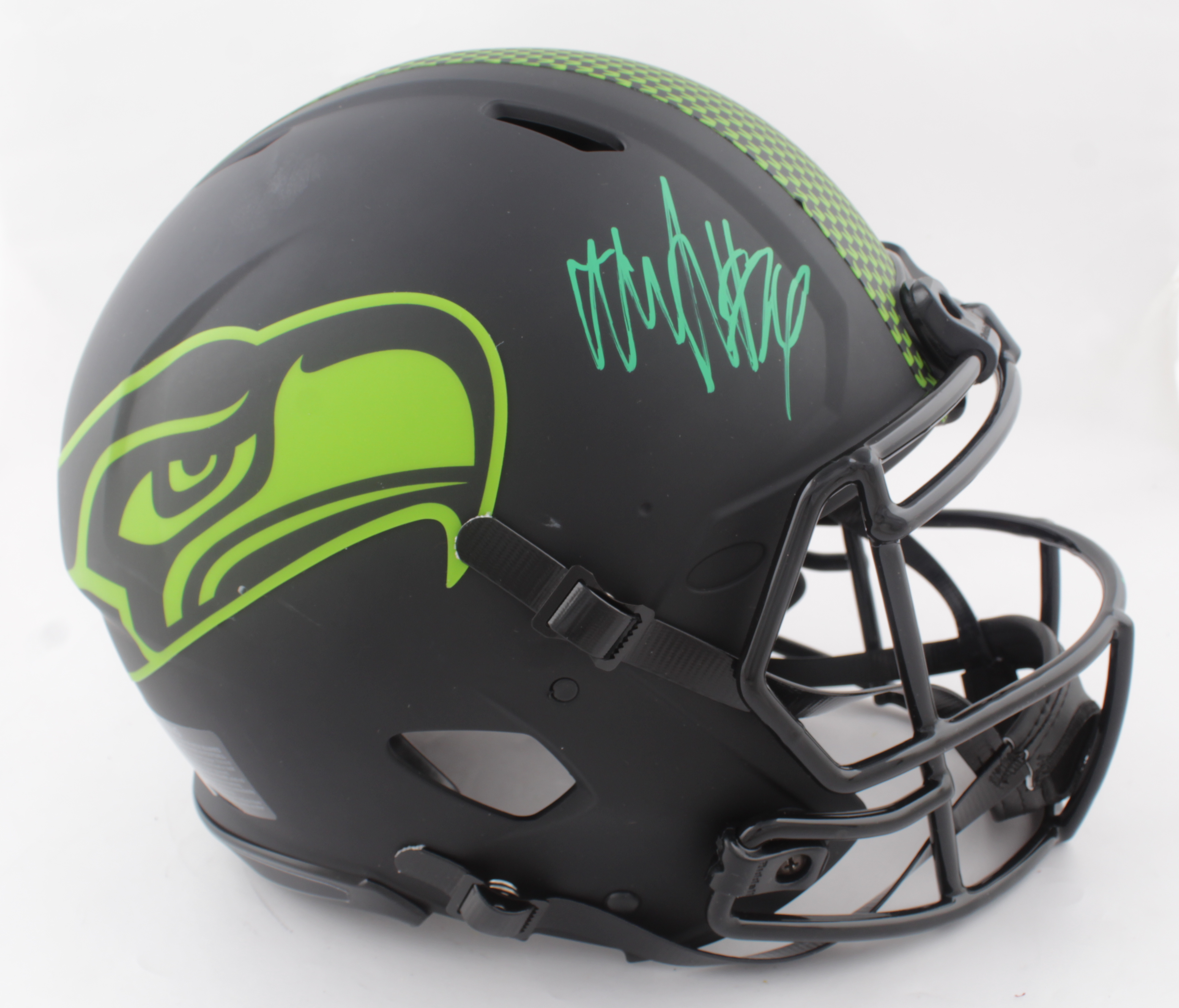 Riddell Seattle Seahawks full-size authentic on-field Eclipse Alternate Speed helmet. Hand-signed by Marshawn Lynch. Please note, there is a mark on the logo on the rigth side of the helmet and the logo on the left side of the helmet is bubbling.