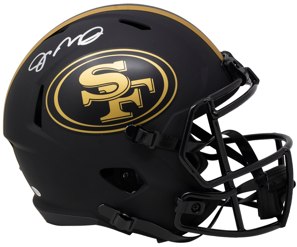 Riddell San Francisco 49ers full-size eclipse alternate speed replica helmet has been hand-signed by Joe Montana (HOF).