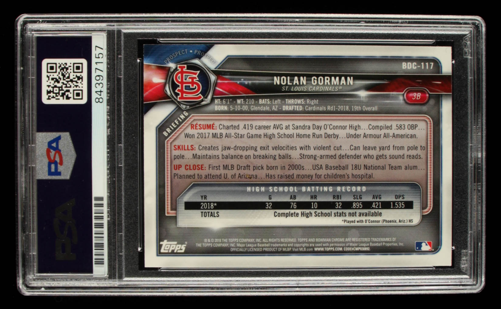 Nolan Gorman Signed 2018 Bowman Chrome Draft #BDC117 (PSA Encapsulated)