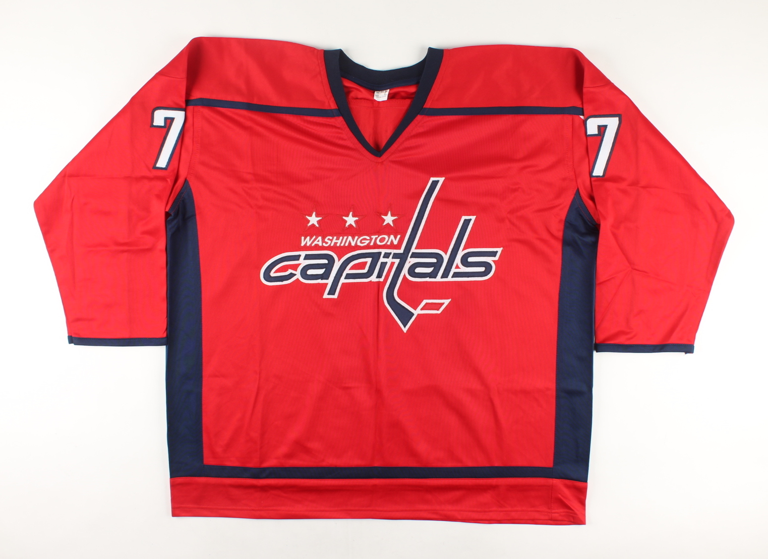 Custom on-ice style jersey. Everything sewn on, size XL. Hand-signed and inscribed by T.J. Oshie.