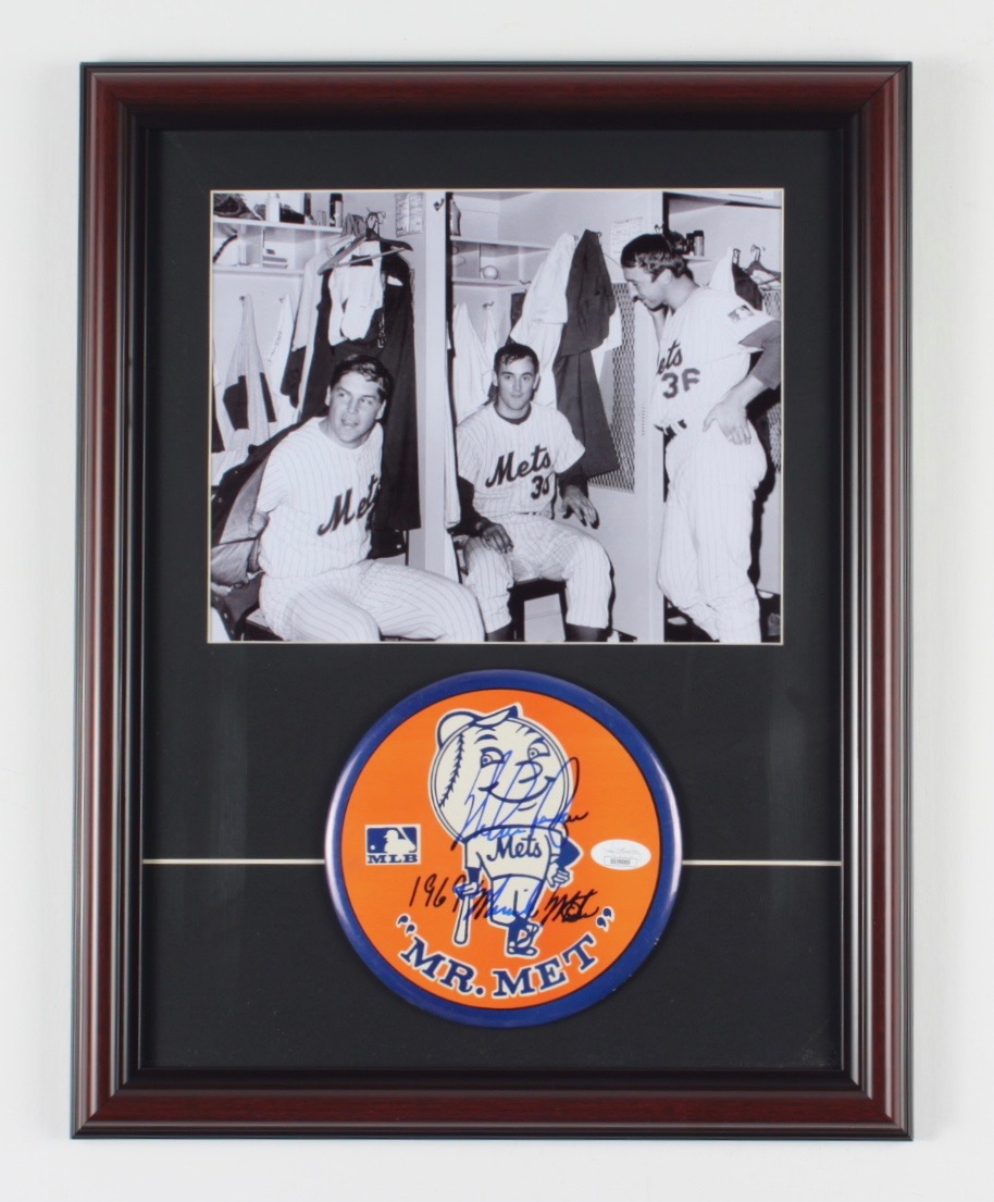 Frame measures approximately 14" x 18" in size and features a pin that has been hand-signed and inscribed by Nolan Ryan (New York Mets, HOF). Display also features a photo of Nolan Ryan.