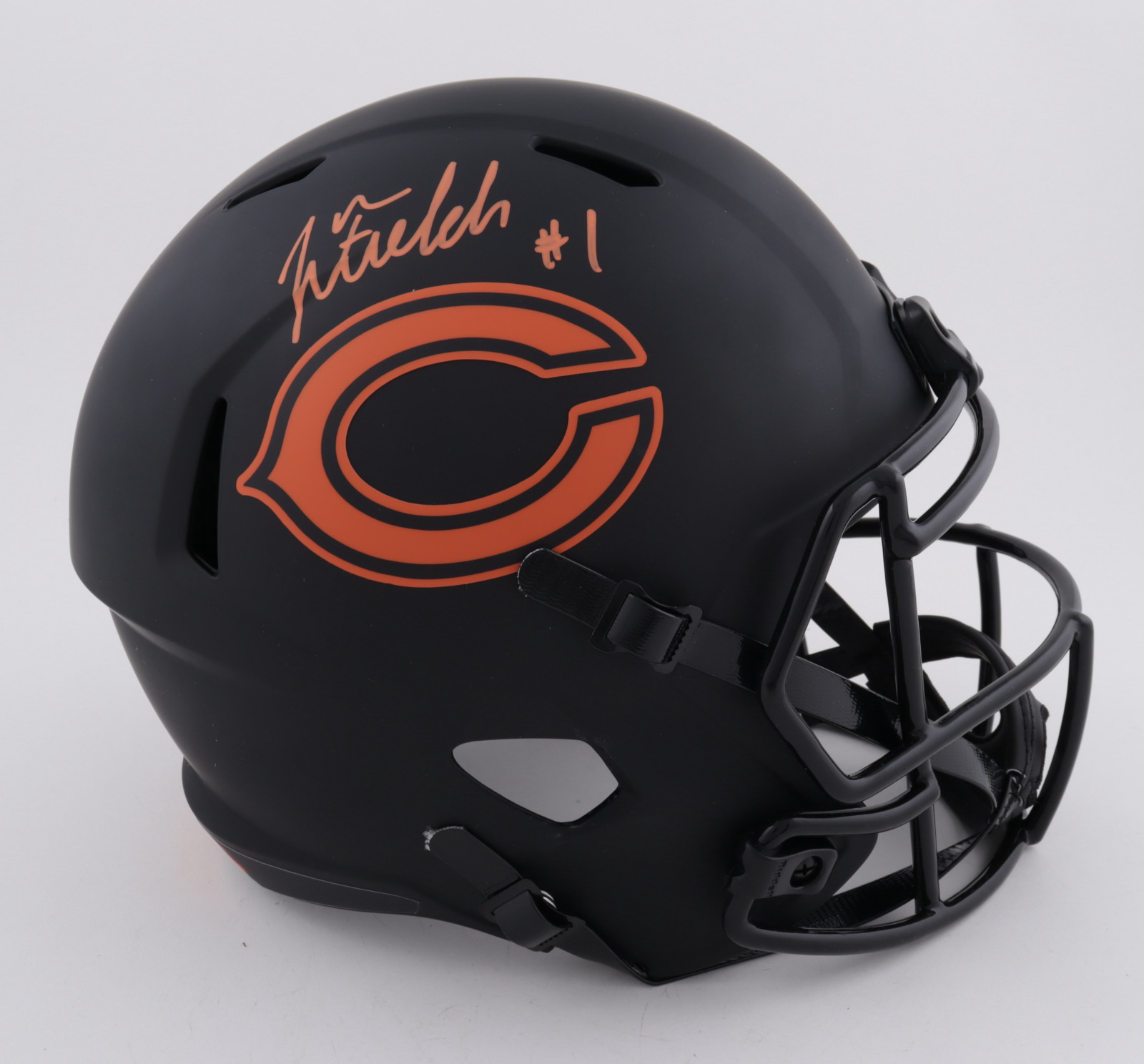 Riddell Chicago Bears full-size replica Eclipse Alternate Speed helmet. Hand-signed by Justin Fields.