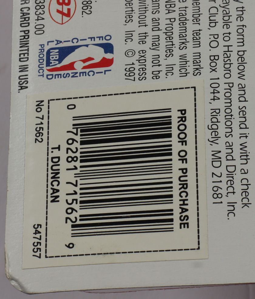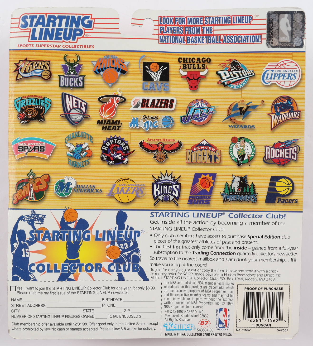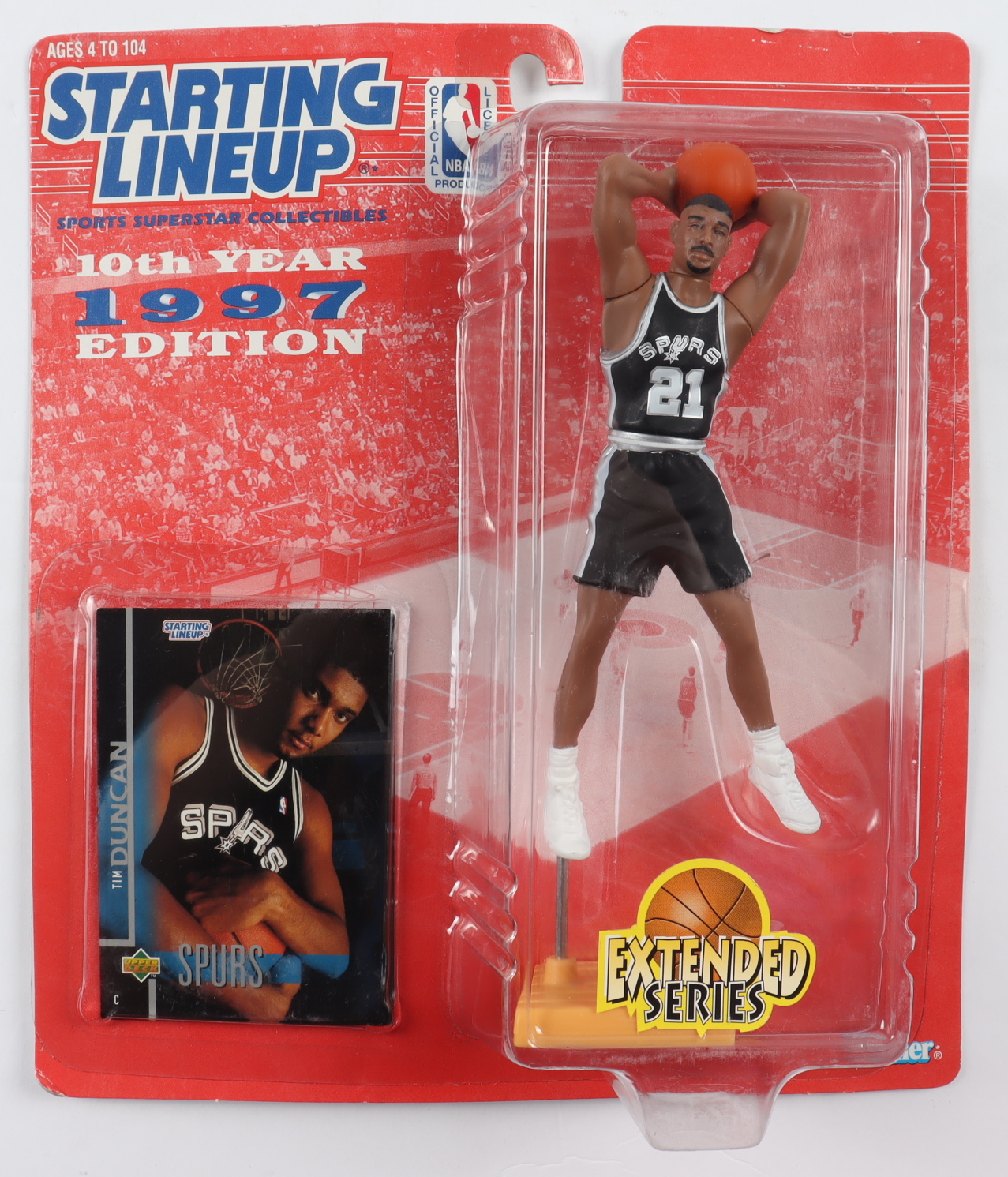 1997 NBA Starting Lineup Sports Super Star Collectible Tim Duncan (San Antonio Spurs, HOF) action figure with Upper Deck Starting Lineup Tim Duncan Card.