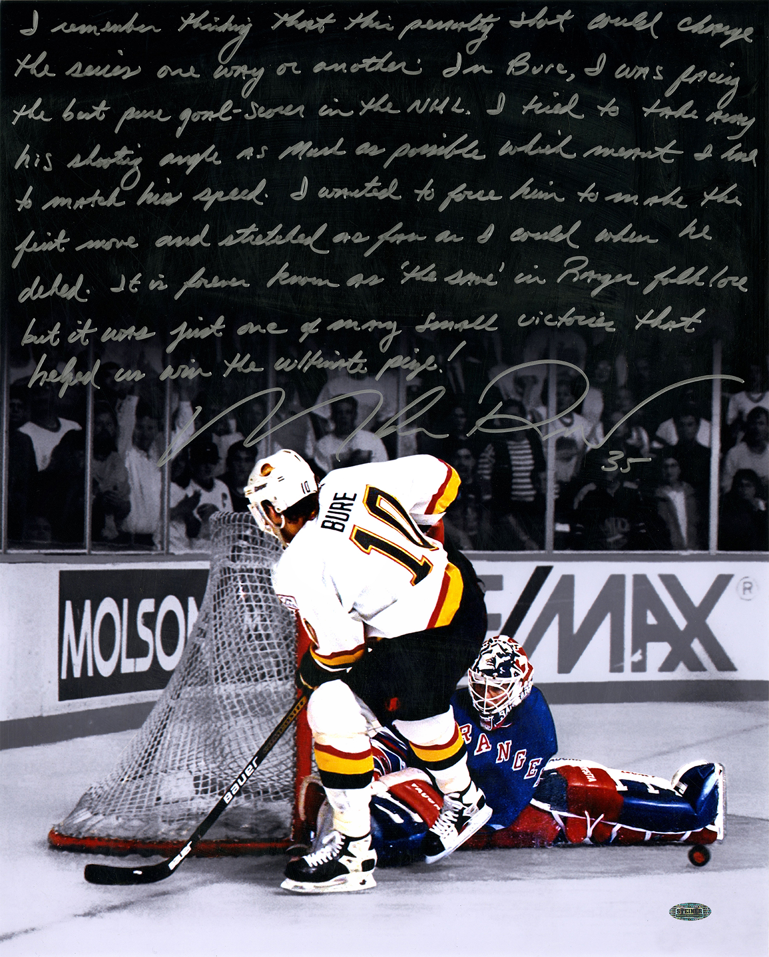 Photo measures 16" x 20" in size and has been hand-signed and inscribed in silver paint pen by Mike Richter (HOF). The photo also features Mike Richter's retelling of his split save of Pavel Bure's penalty shot in Game 4 of the 1994 Stanley Cup Finals.