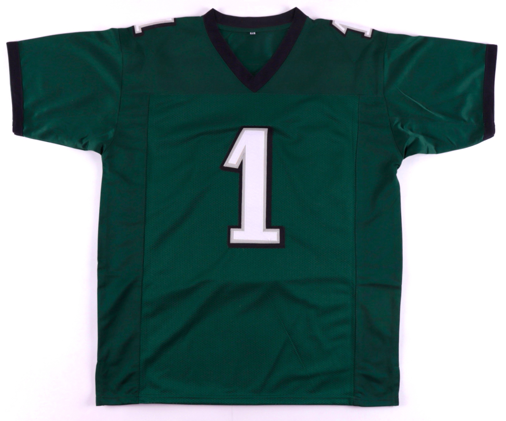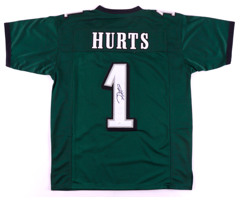 Custom on-field style jersey. Everything is sewn on, size XL. Hand-signed by Jalen Hurts.