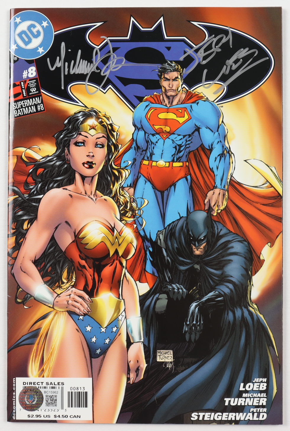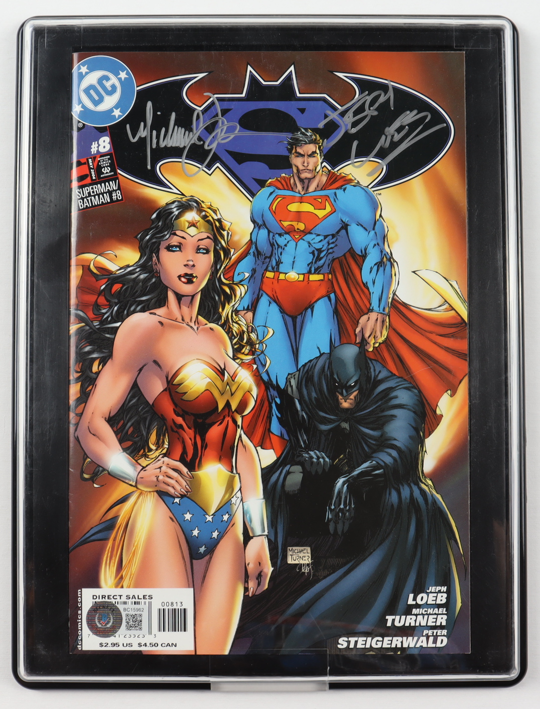"Superman/Batman" Issue #8 has been hand-signed by Jeph Loeb (Writer) and the artist Michael Turner (D. 2008). Display case is included.