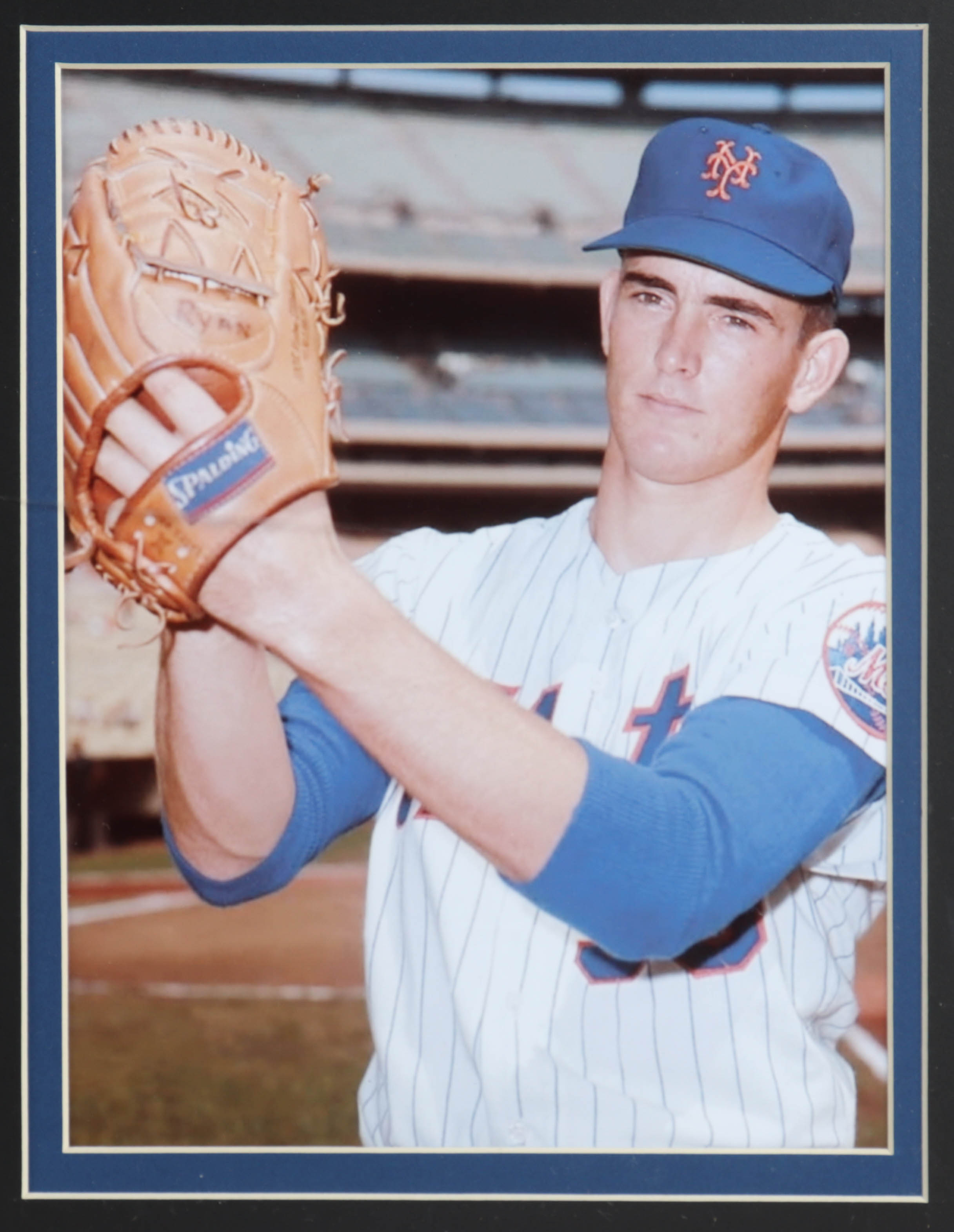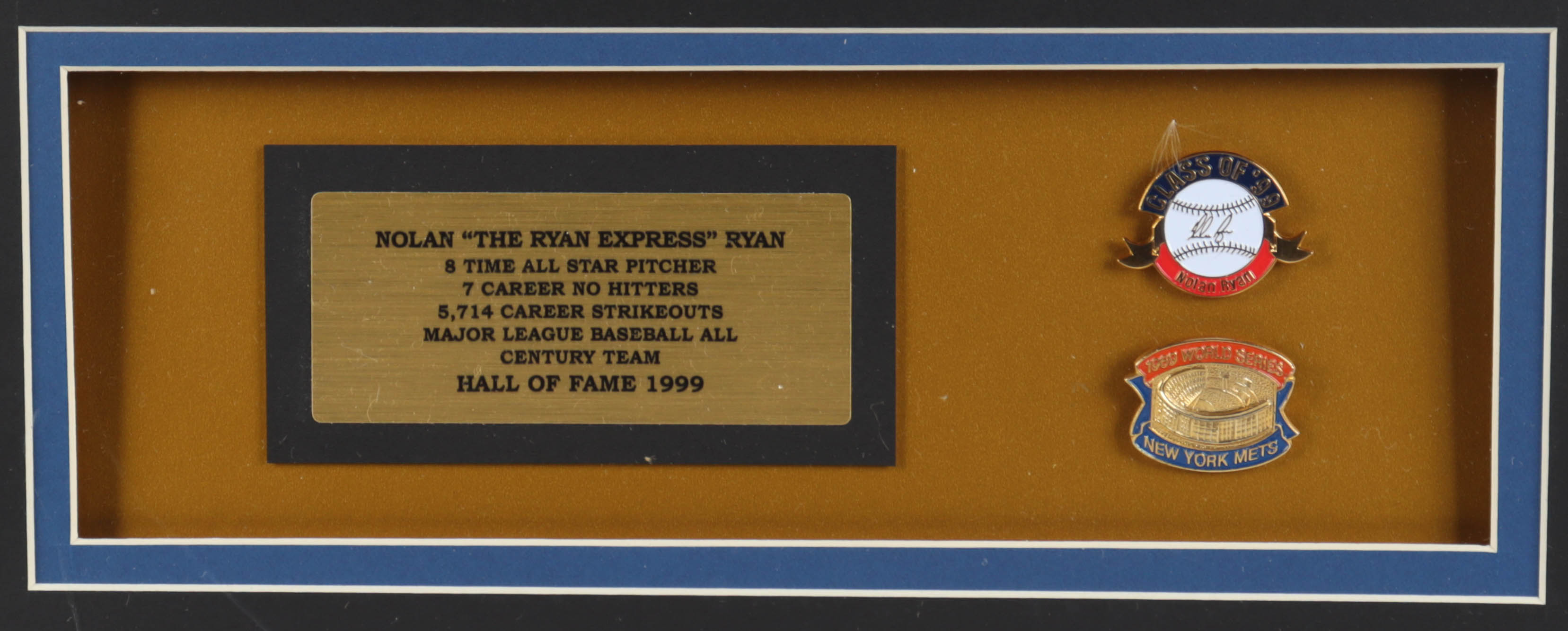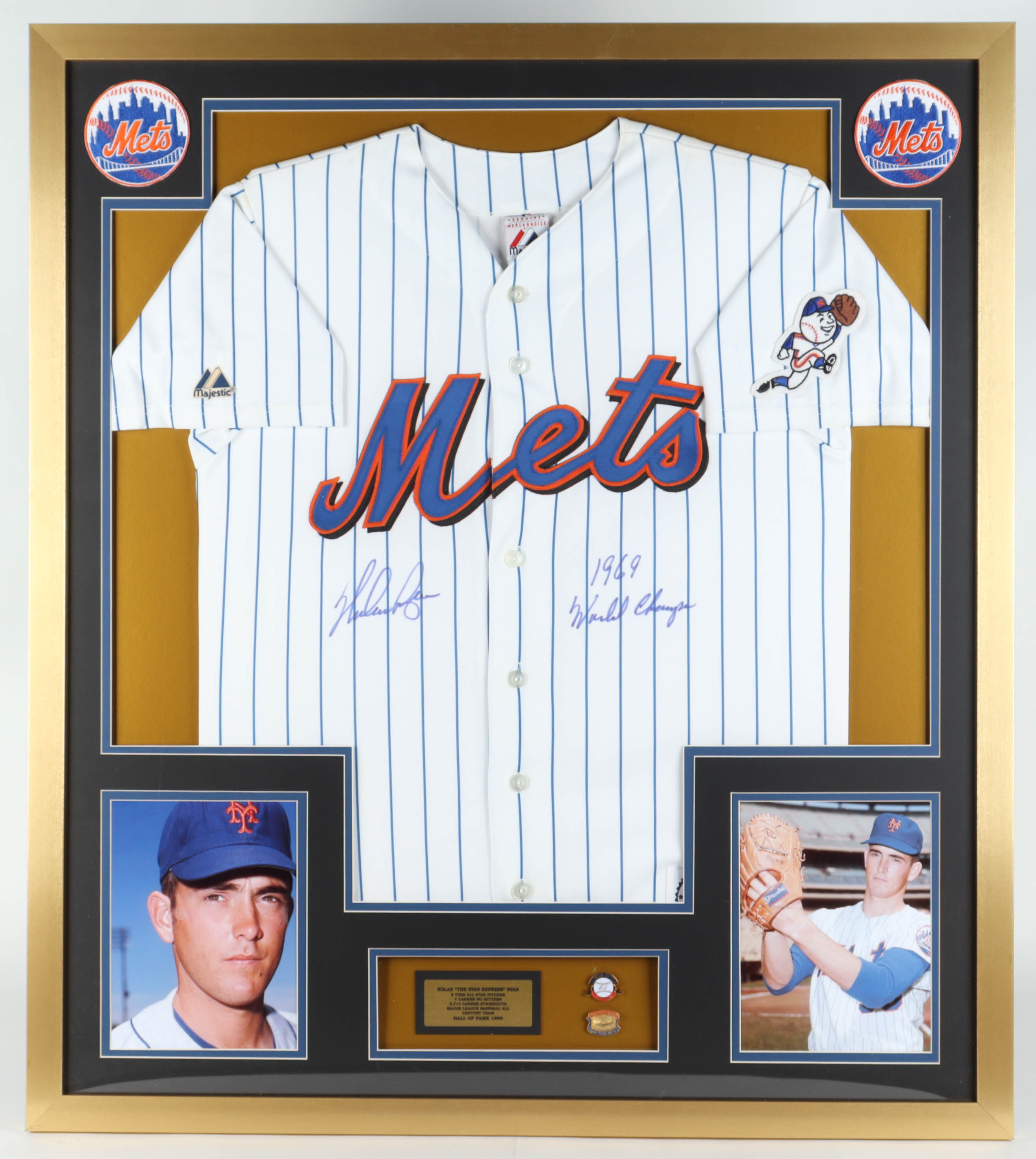 Custom frame measures 32" x 36" in size and features a Majestic jersey that has been hand-signed and inscribed by Nolan Ryan (New York Mets, HOF). Display also features a 1969 World Series pin and Hall of Fame Pin.