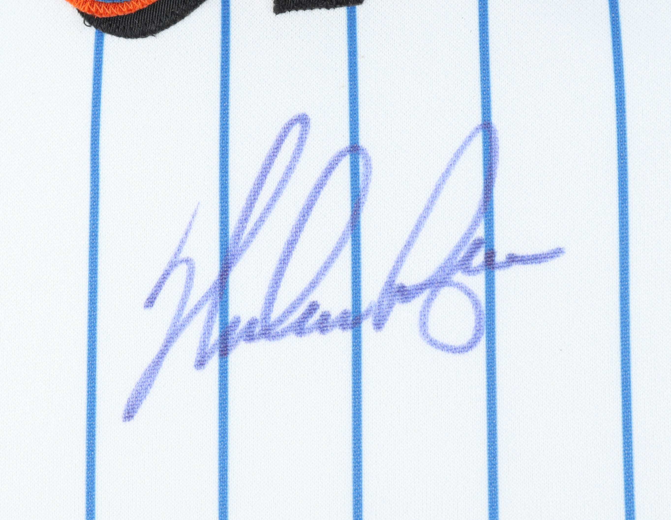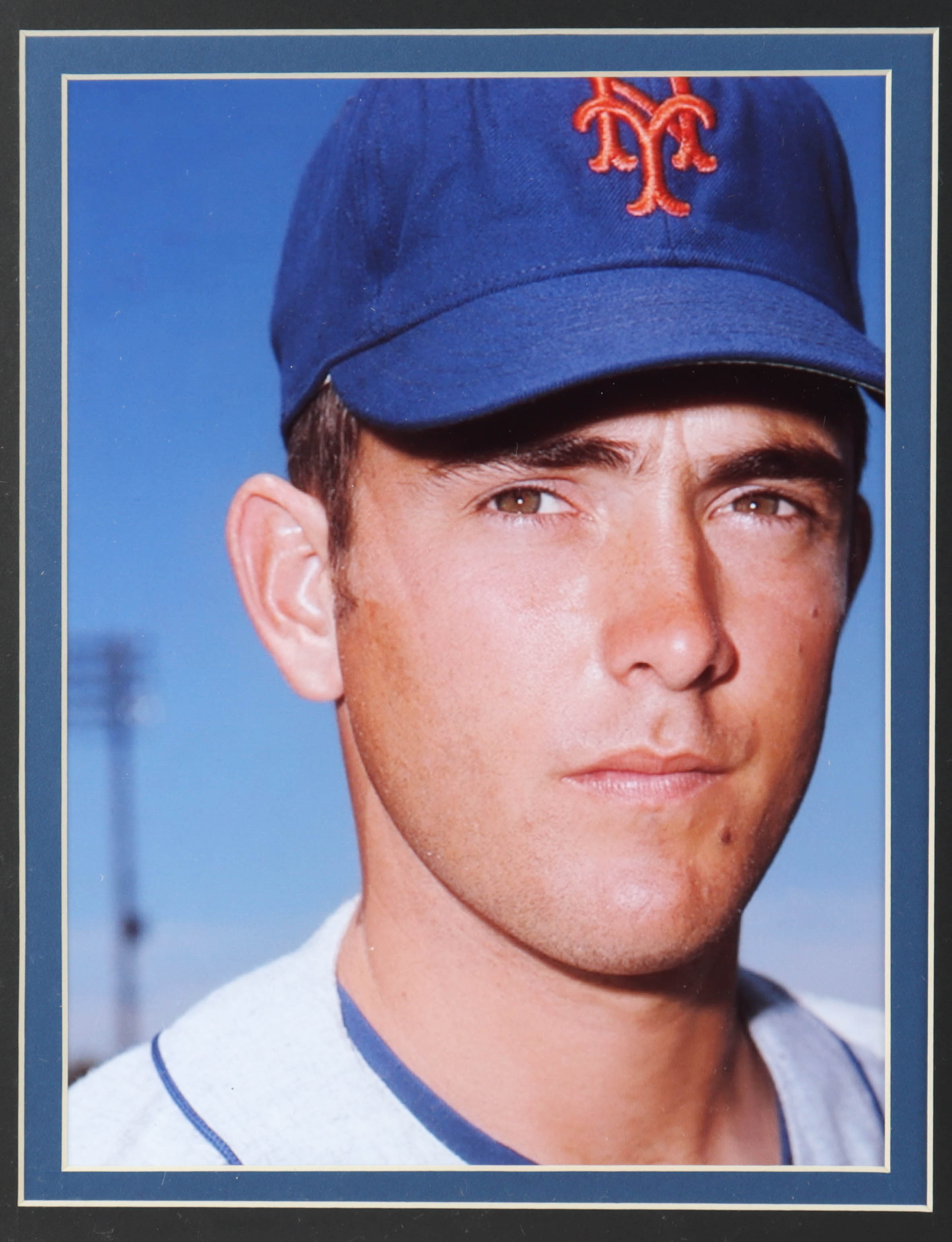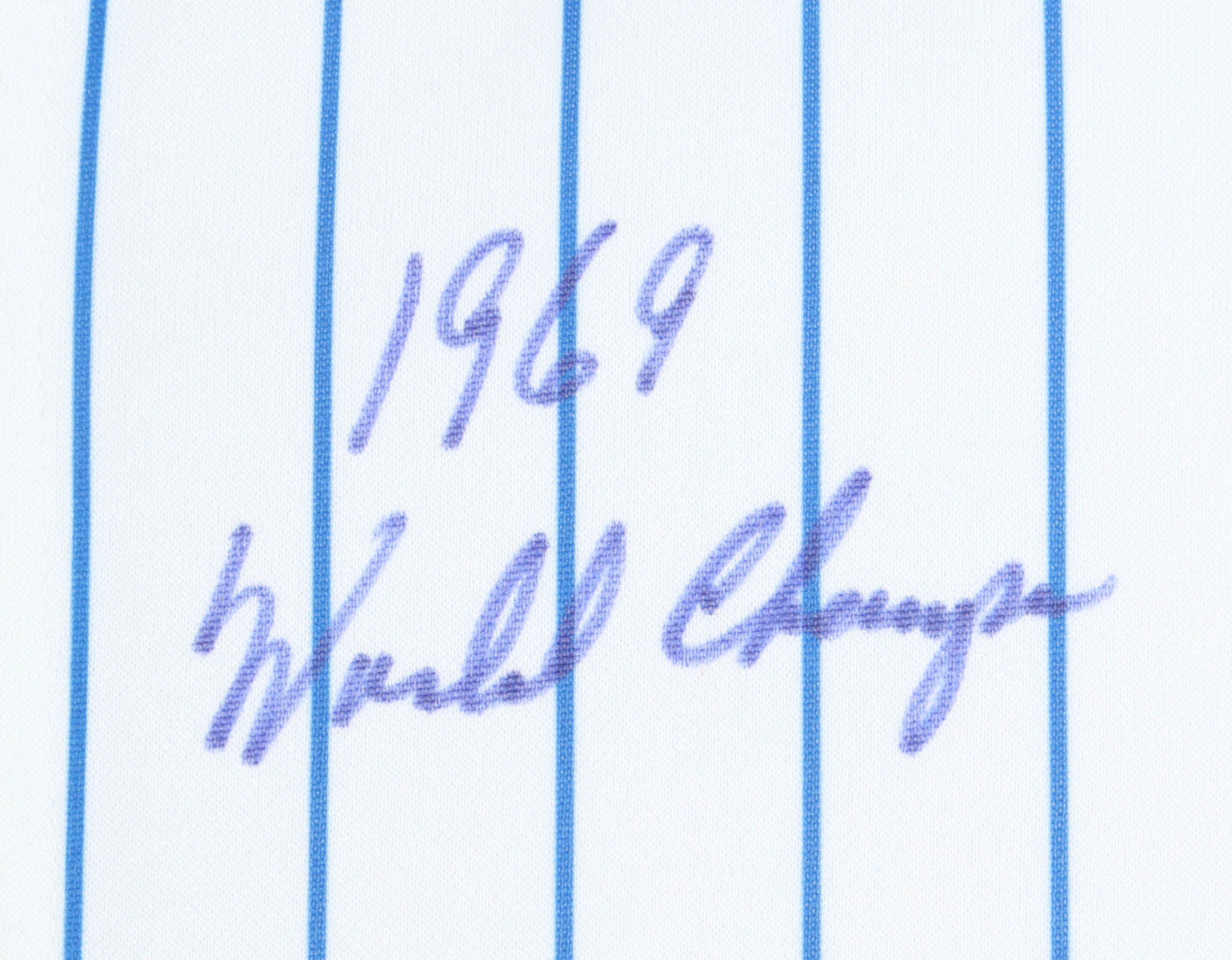 Custom frame measures 32" x 36" in size and features a Majestic jersey that has been hand-signed and inscribed by Nolan Ryan (New York Mets, HOF). Display also features a 1969 World Series pin and Hall of Fame Pin.