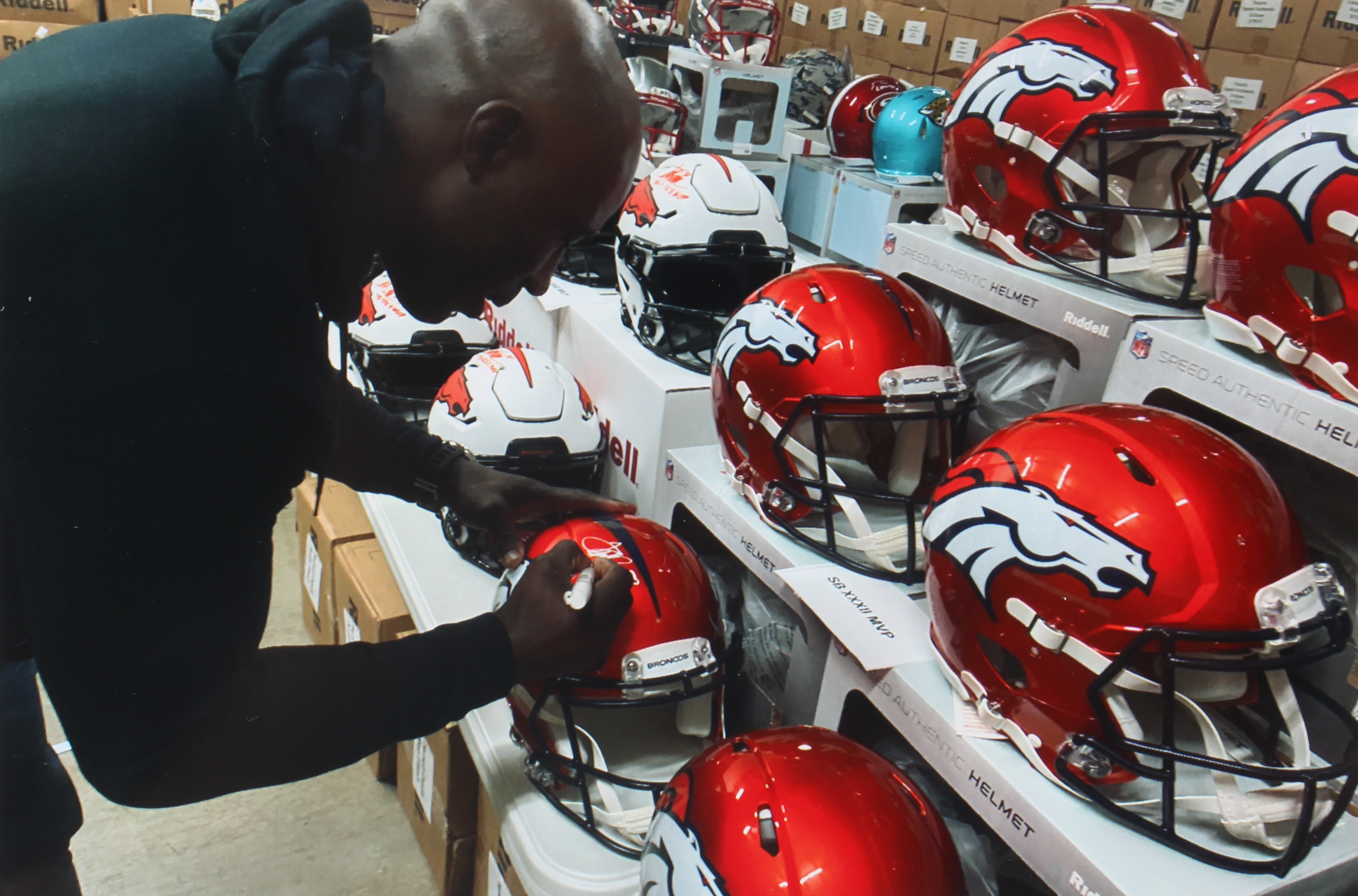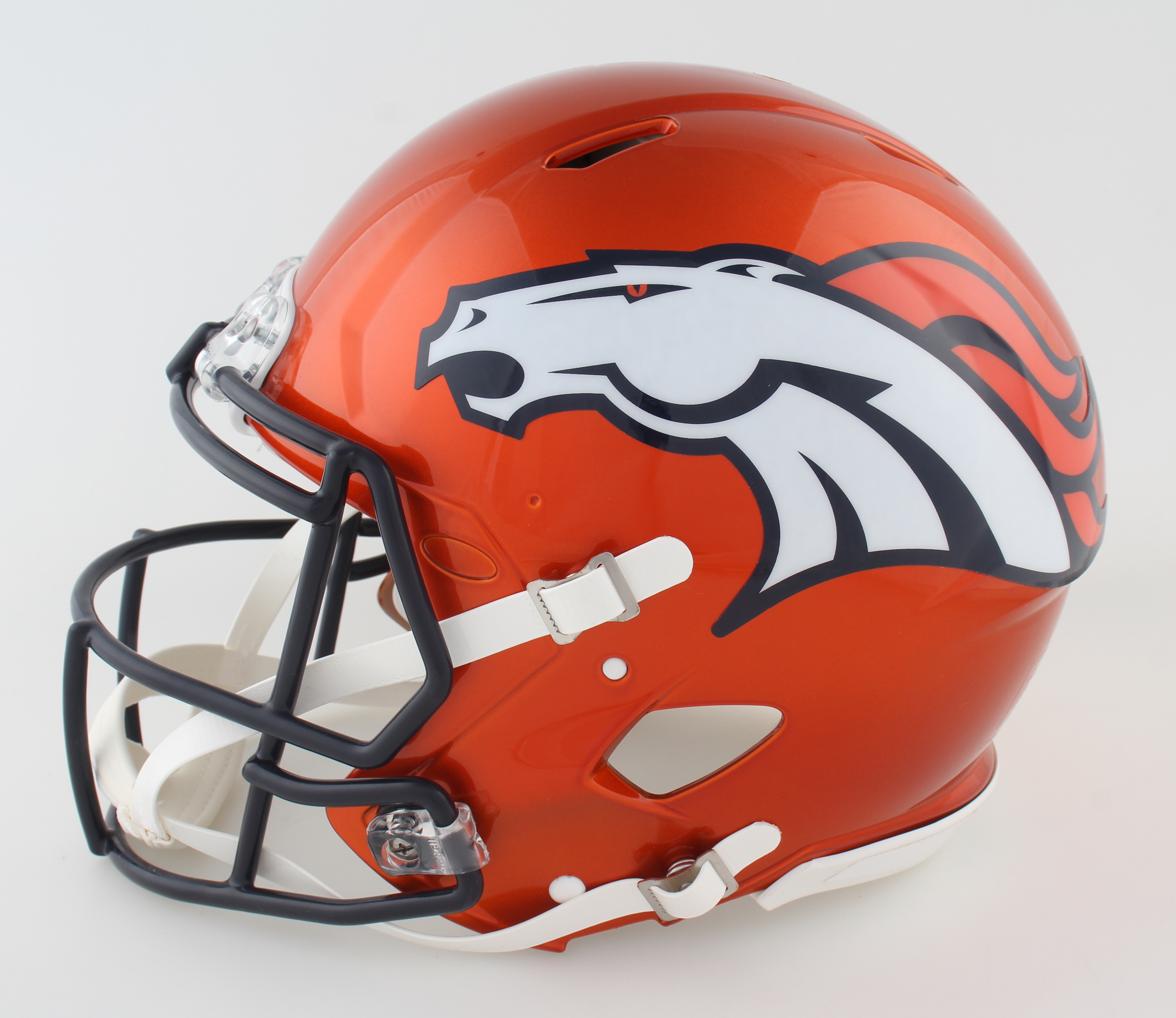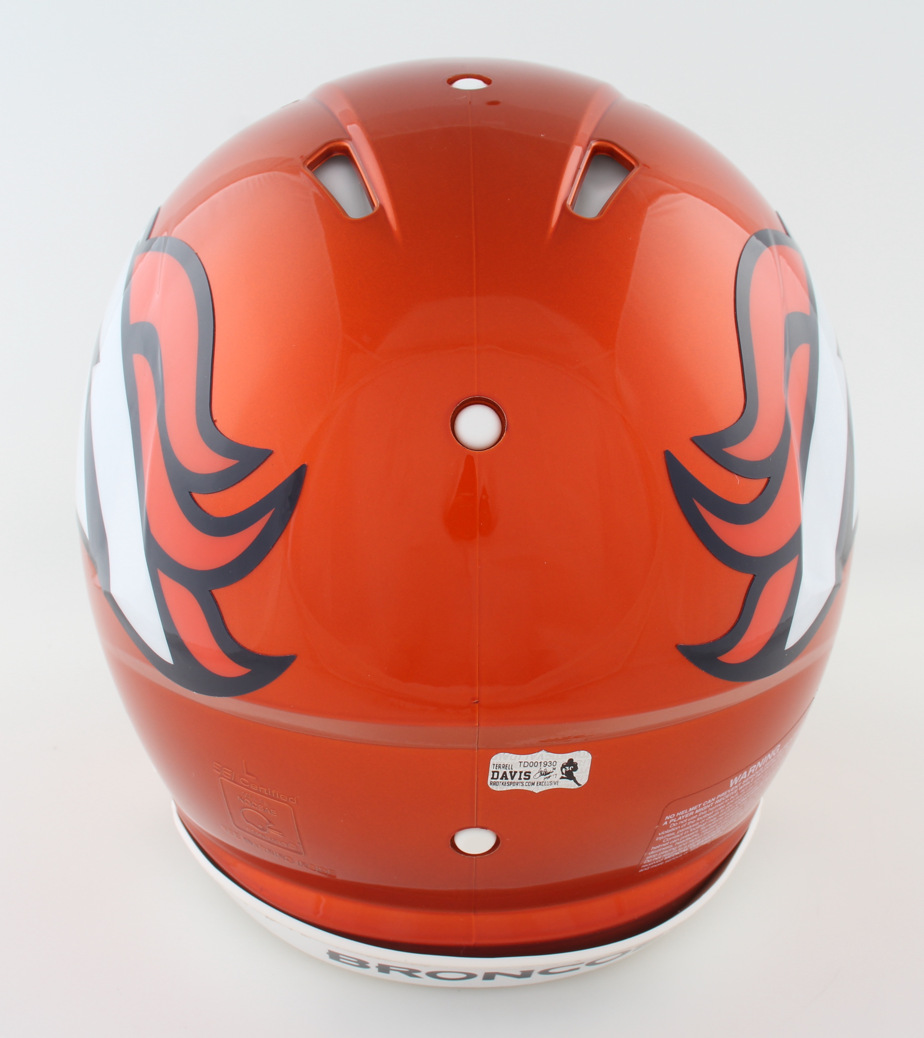 Riddell Denver Broncos full-size authentic on-field Flash Alternate Speed helmet. Hand-signed and inscribed by Terrell Davis (HOF).