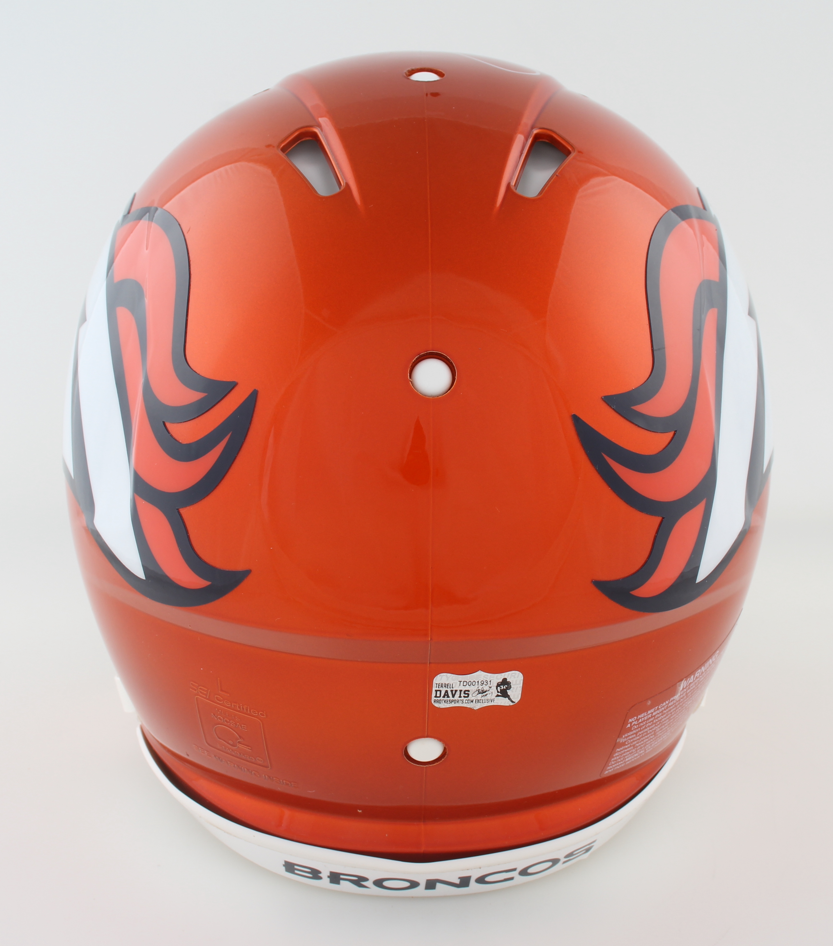 Riddell Denver Broncos full-size authentic on-field Flash Alternate Speed helmet. Hand-signed and inscribed by Terrell Davis (HOF).