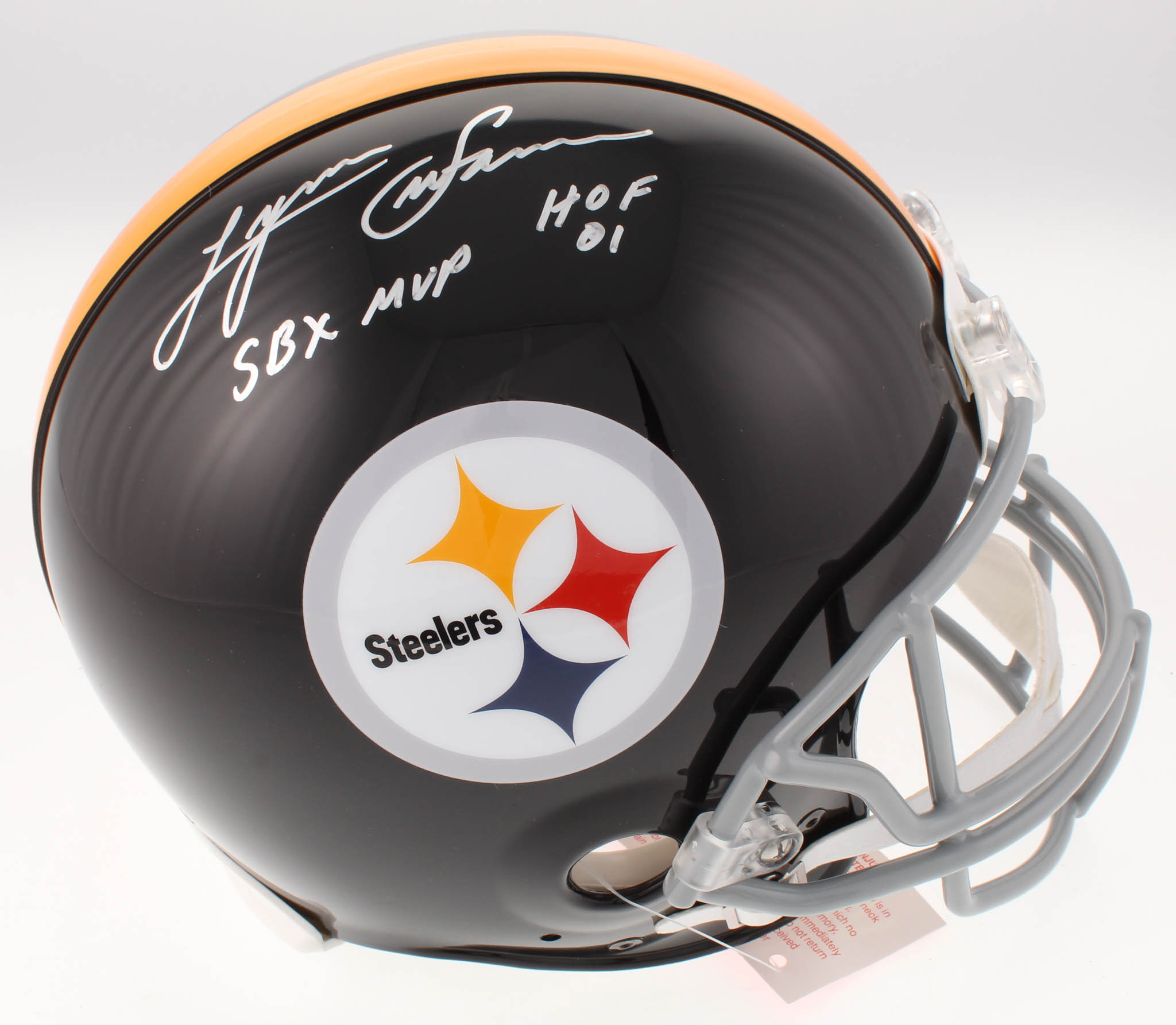 Pittsburgh Steelers full-size authentic on-field helmet. Hand-signed and inscribed by Lynn Swann (HOF).