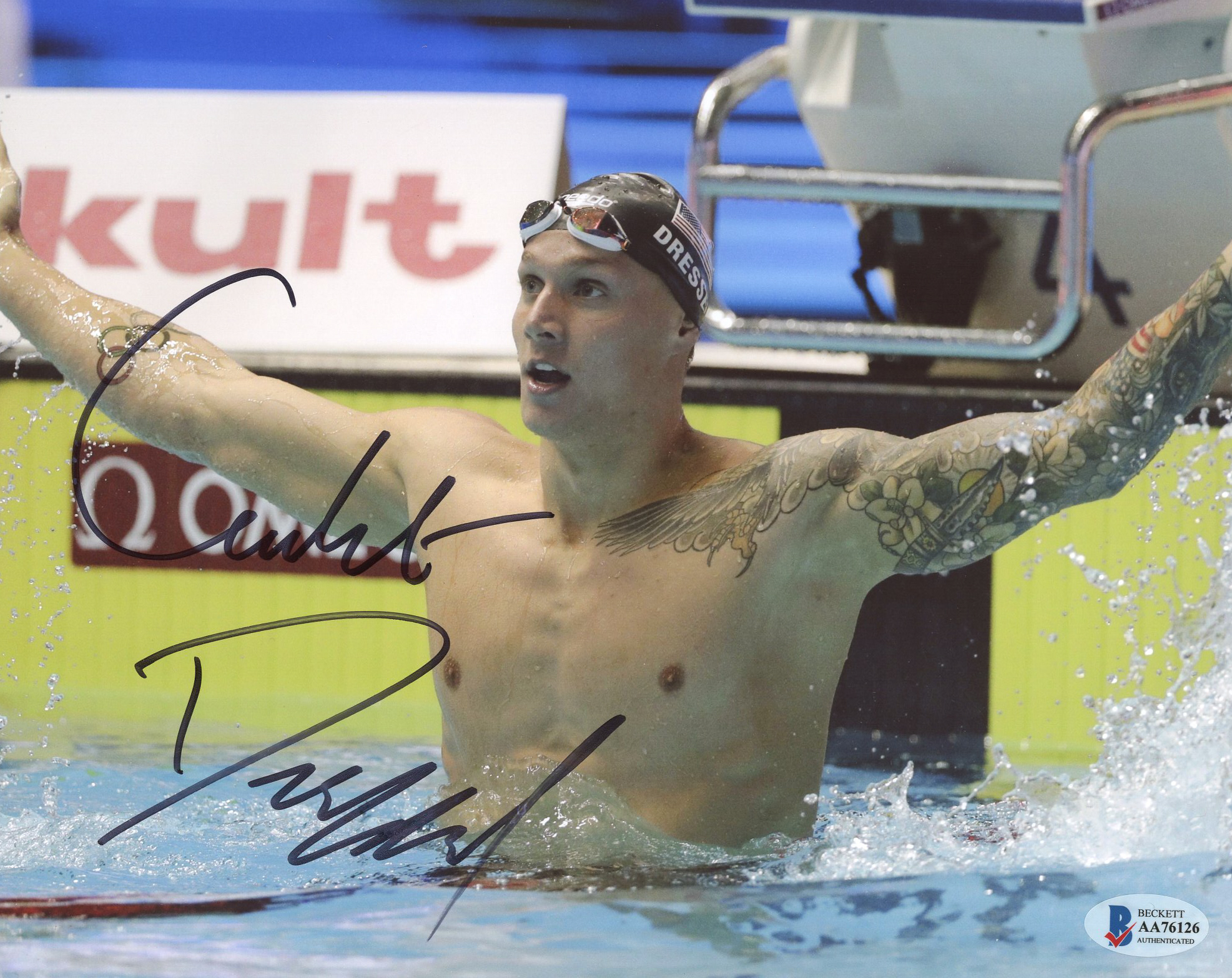 Photo measures 8" x 10" in size and has been hand-signed by Caeleb Dressel.