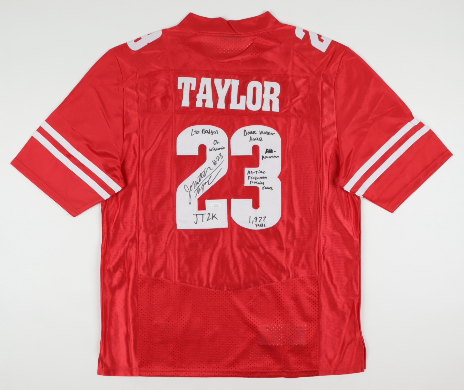 Custom on-field style jersey. Everything is sewn on, size XL. Hand-signed and inscribed by Jonathan Taylor.