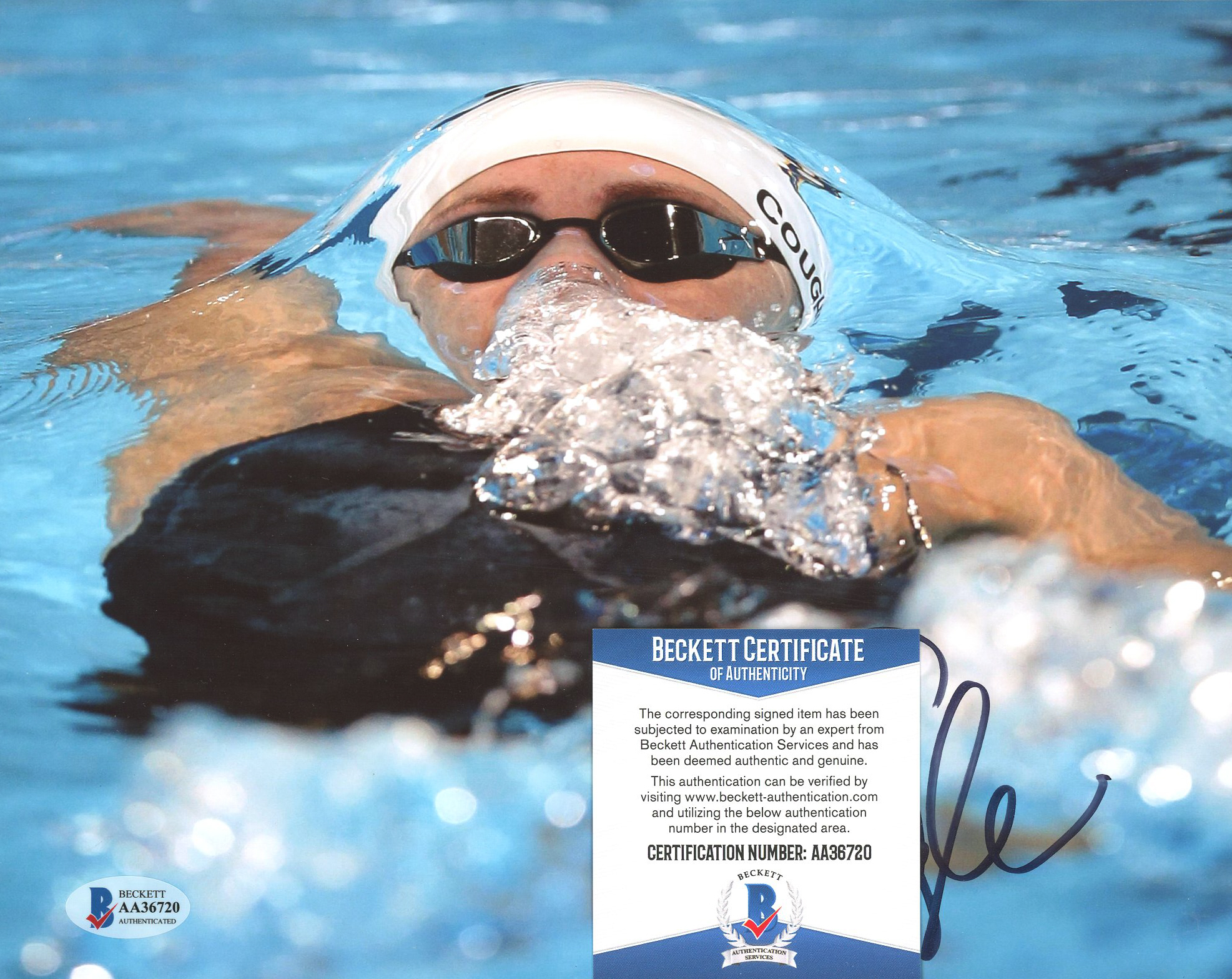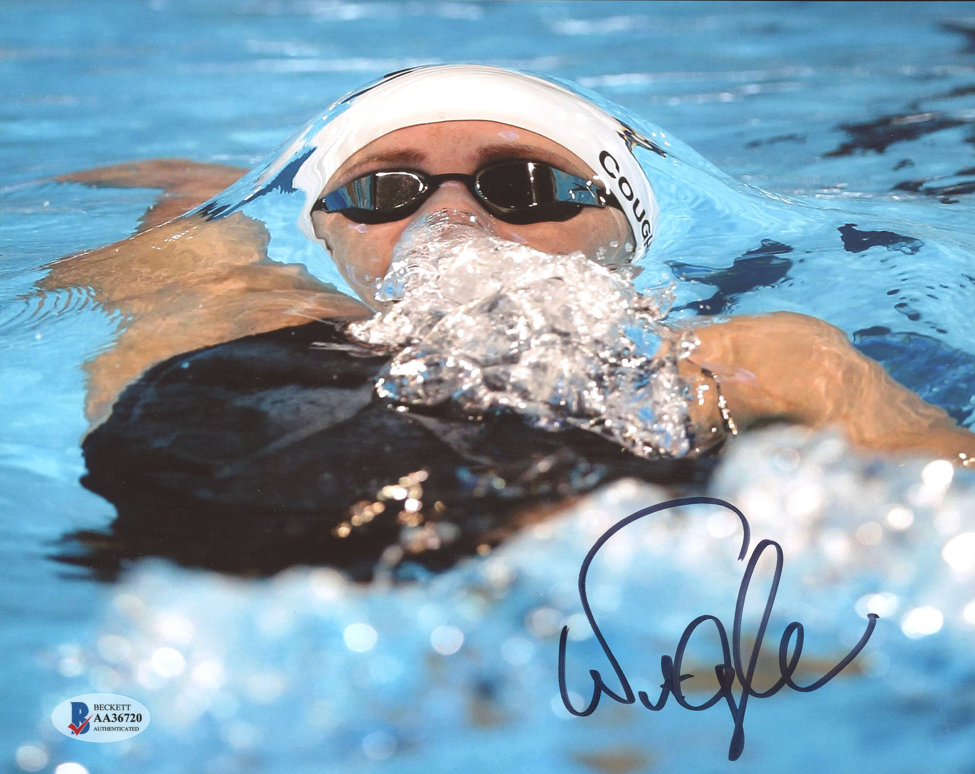 Photo measures 8" x 10" in size and has been hand-signed by Natalie Coughlin.