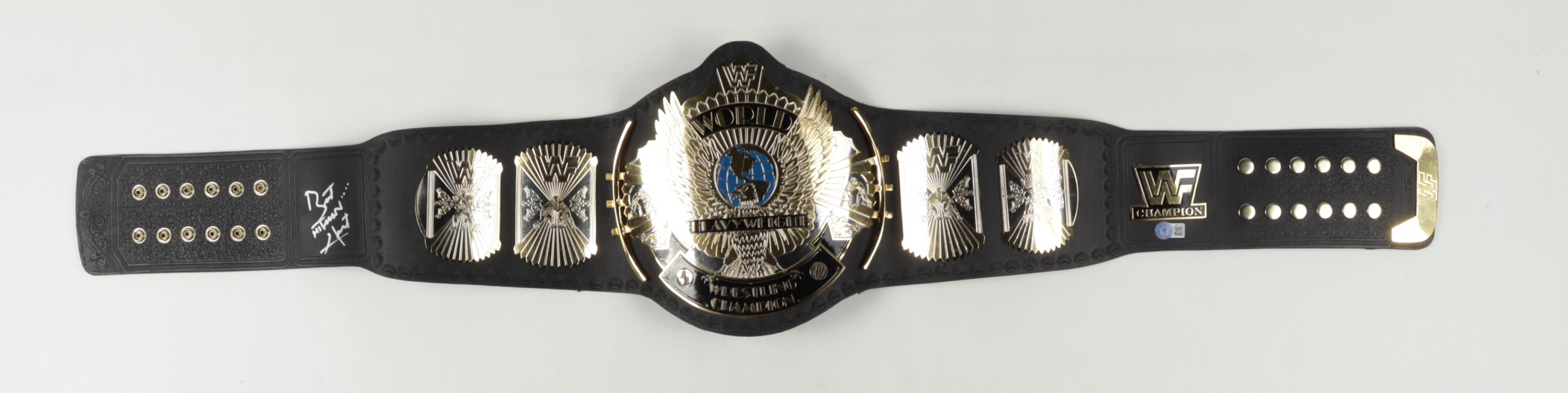 Replica WWE World Heavyweight Wrestling Championship Belt measures approximately 48" in length and has been hand-signed and inscribed by Bret Hart (HOF).