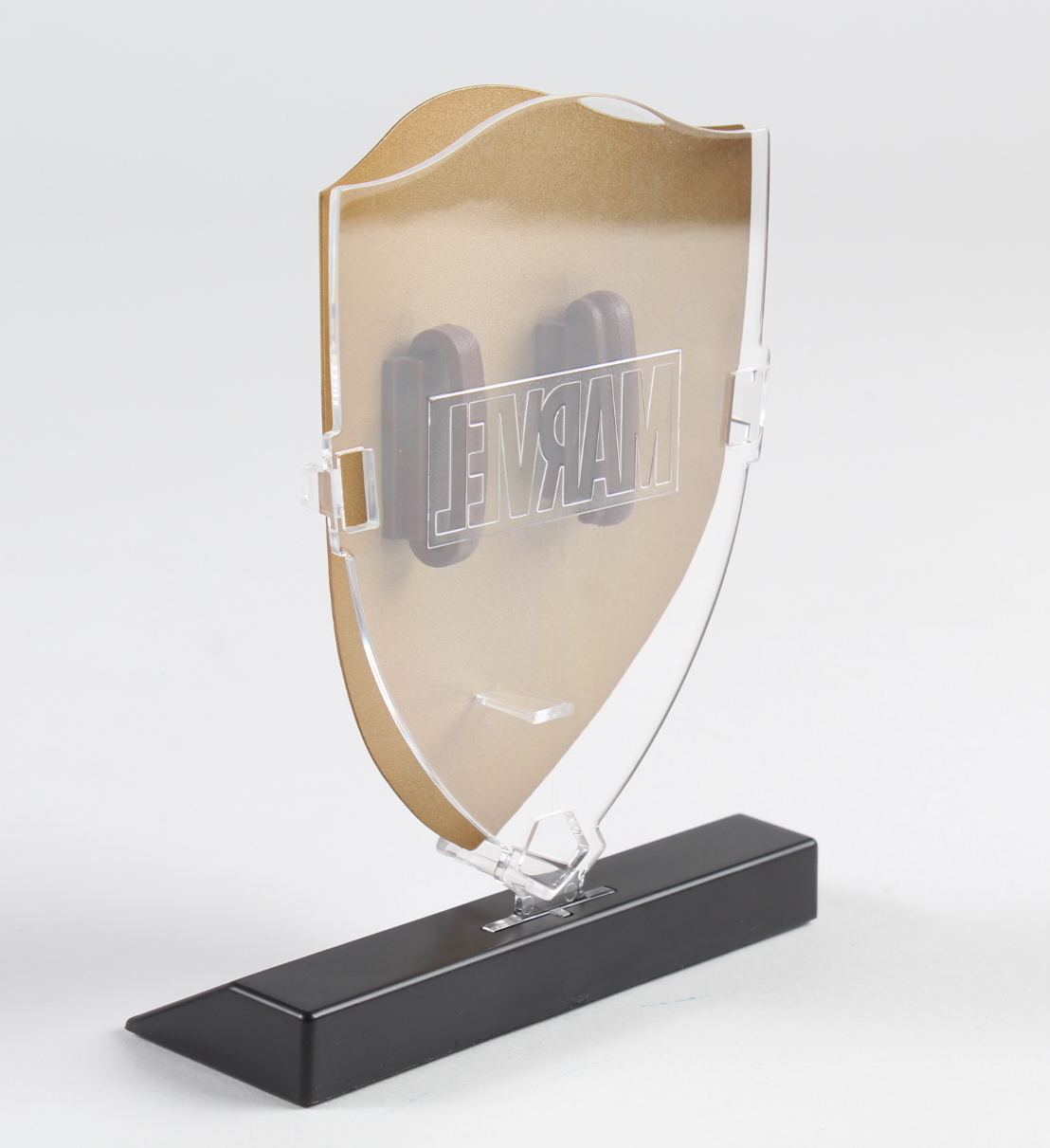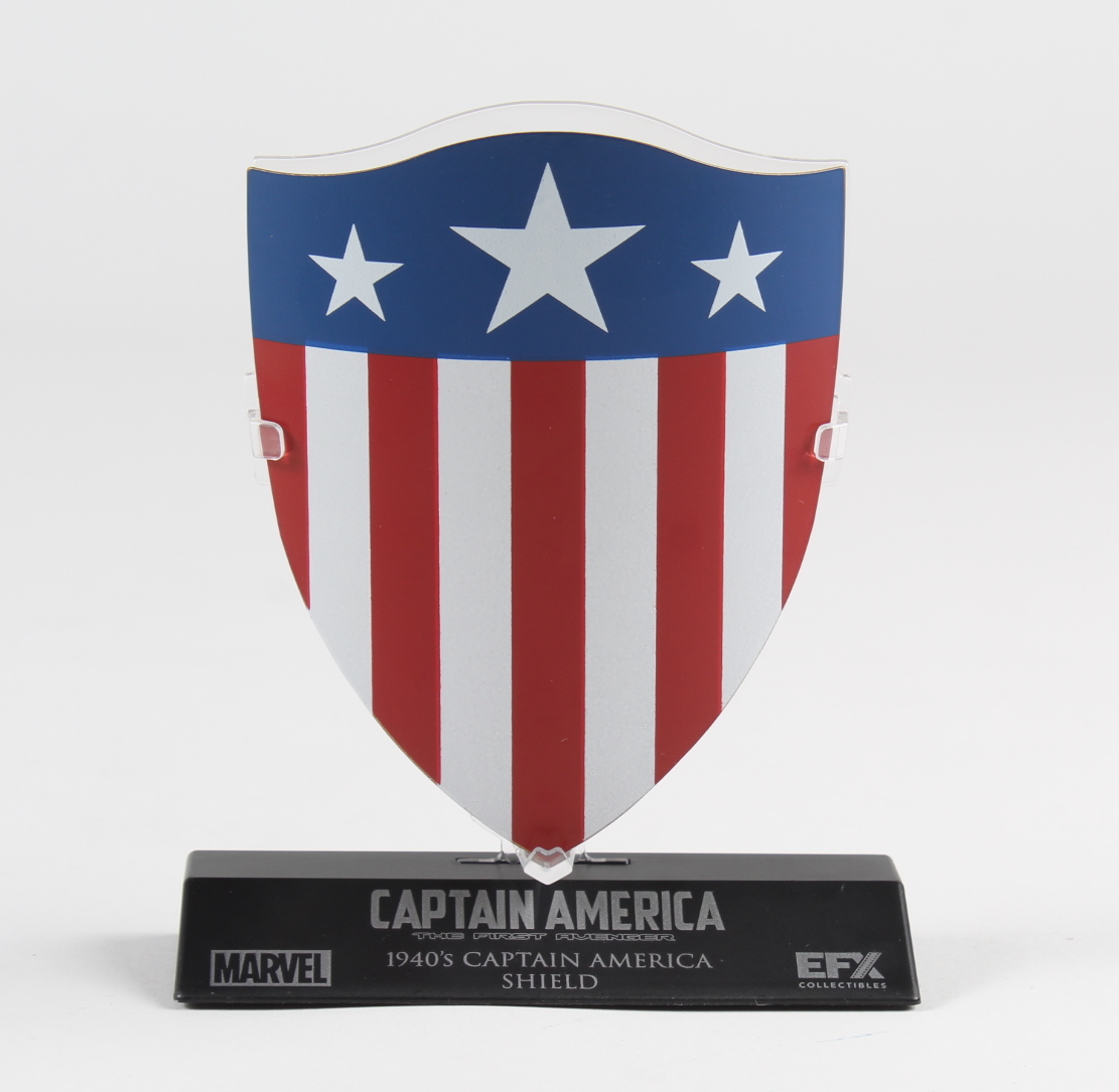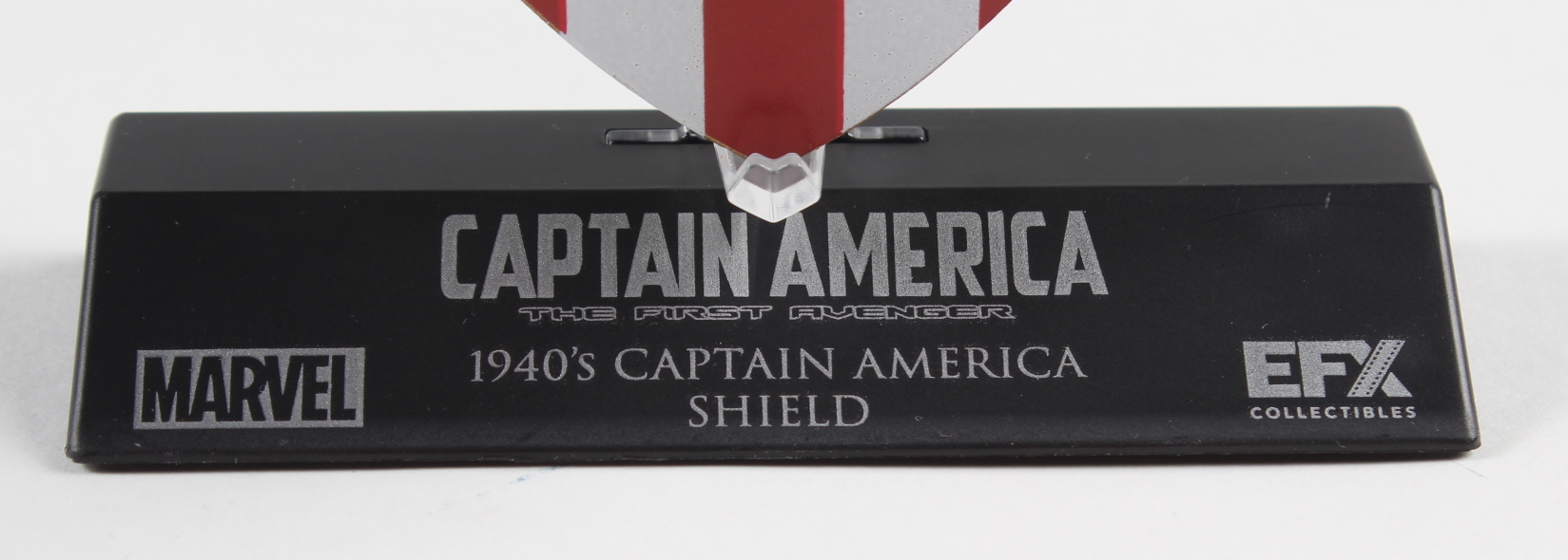 EFX miniature 1:6 scale "Captain America: The First Avenger" 1940s shield prop replica. Measures approximately 5.5" tall with the stand. Created using the original digital files and reference materials from Marvel Studios. Please note, the item is unsigned.