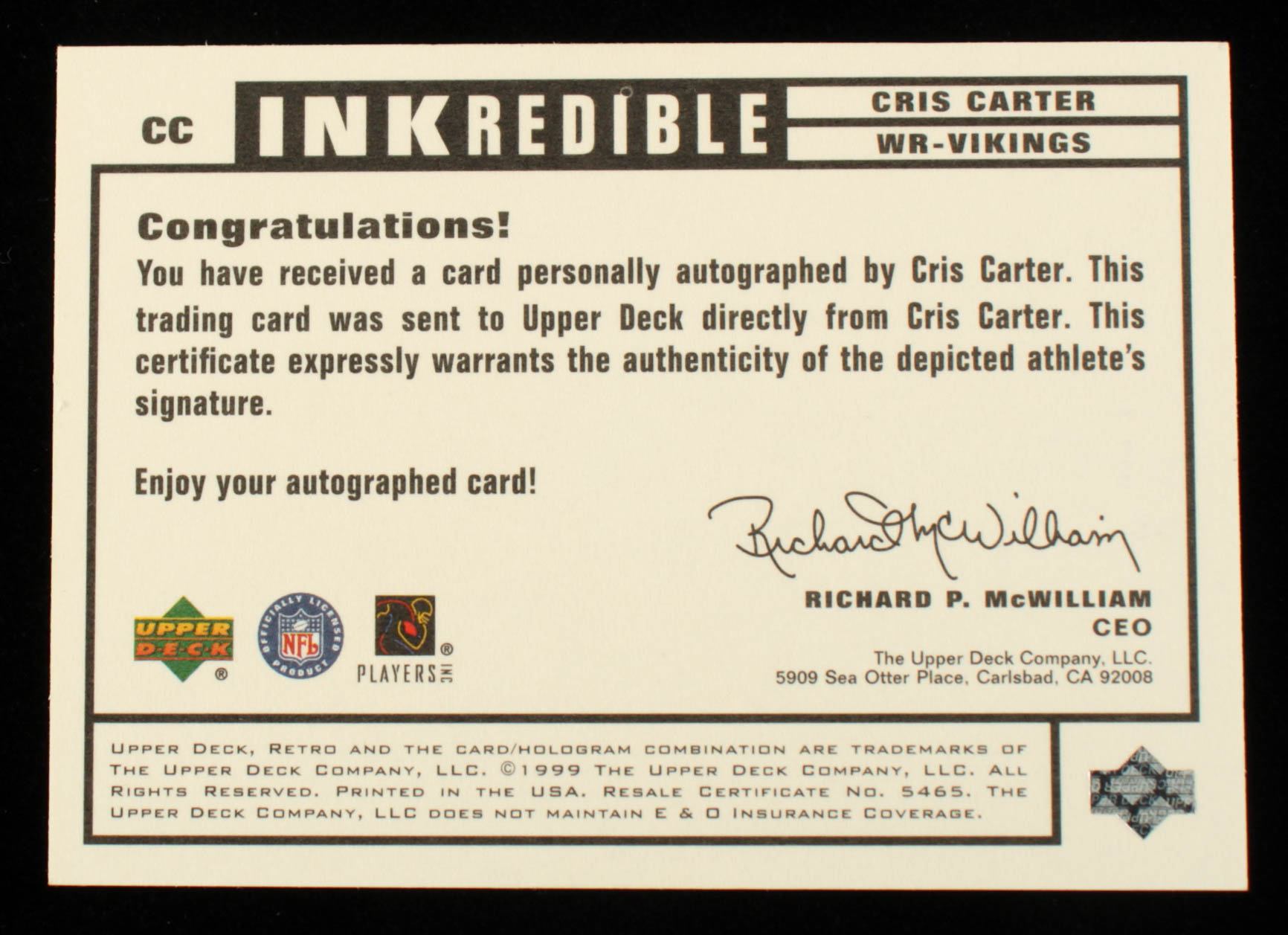 Cris Carter 1999 Upper Deck Retro Inkredible #CC