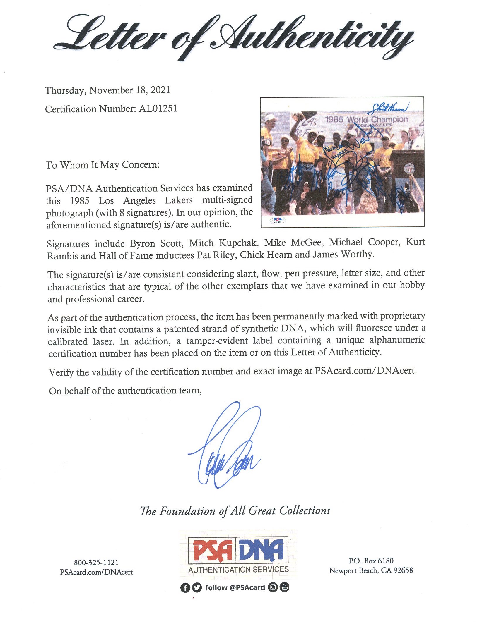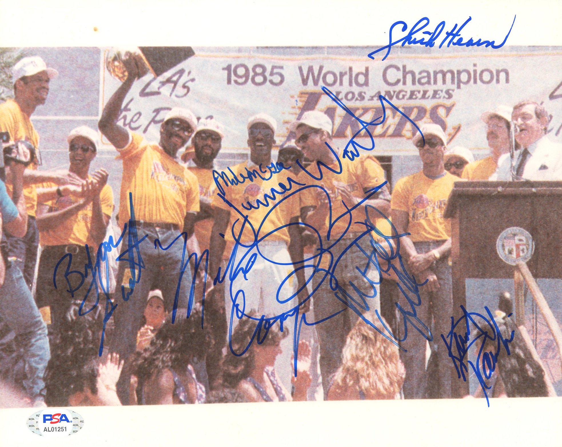 8x10 photo has been team-signed by (8) 1985 Los Angeles Lakers including Byron Scott, Mitch Kupchak, Mike McGee, Michael Cooper, Kurt Rambis, Pat RIley (HOF), Chick Hearn (HOF) and James Worthy (HOF).