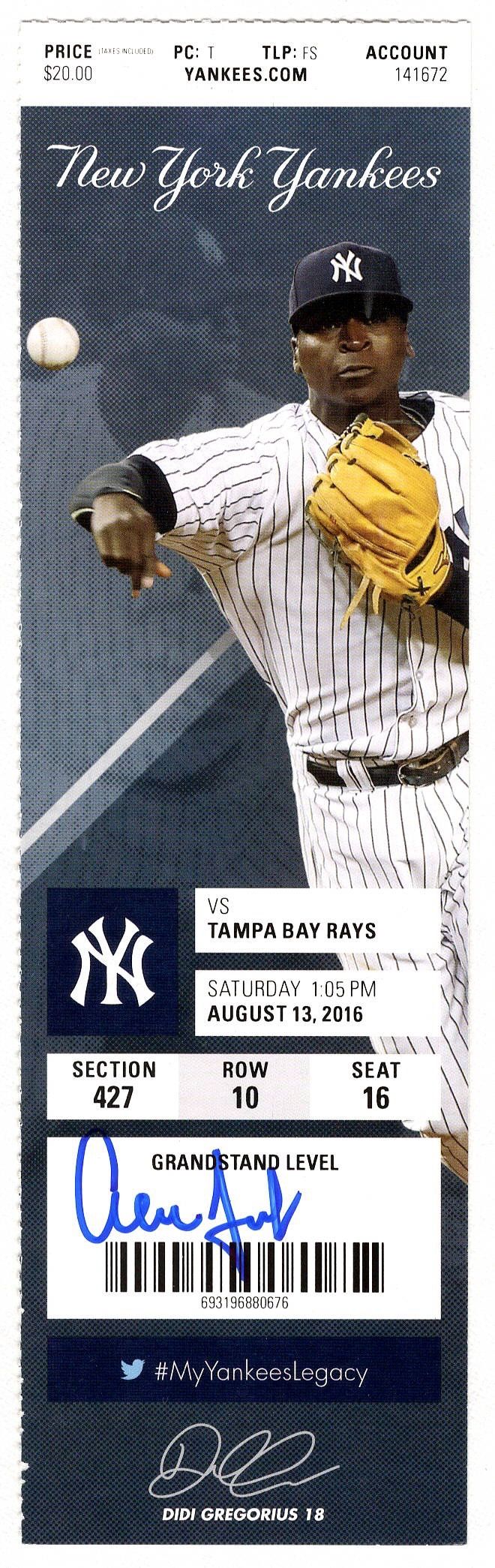 New York Yankees game ticket, dated August 13th 2016, has been hand-signed by Aaron Judge.