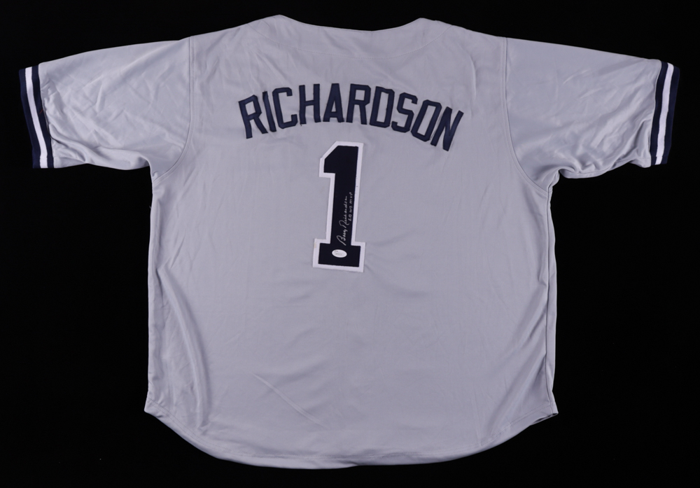 Custom on-field style jersey. Everything is sewn on, size XL. Hand-signed and inscribed by Bobby Richardson. Please note, there is a stain on the reverse number.