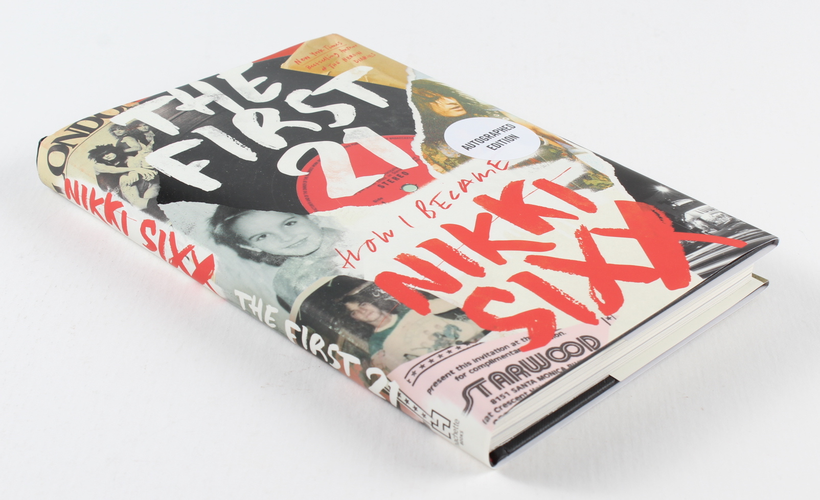 "The First 21: How I Became Nikki Sixx" Hardcover Book. Hand-signed on the inside cover by Nikki Sixx.