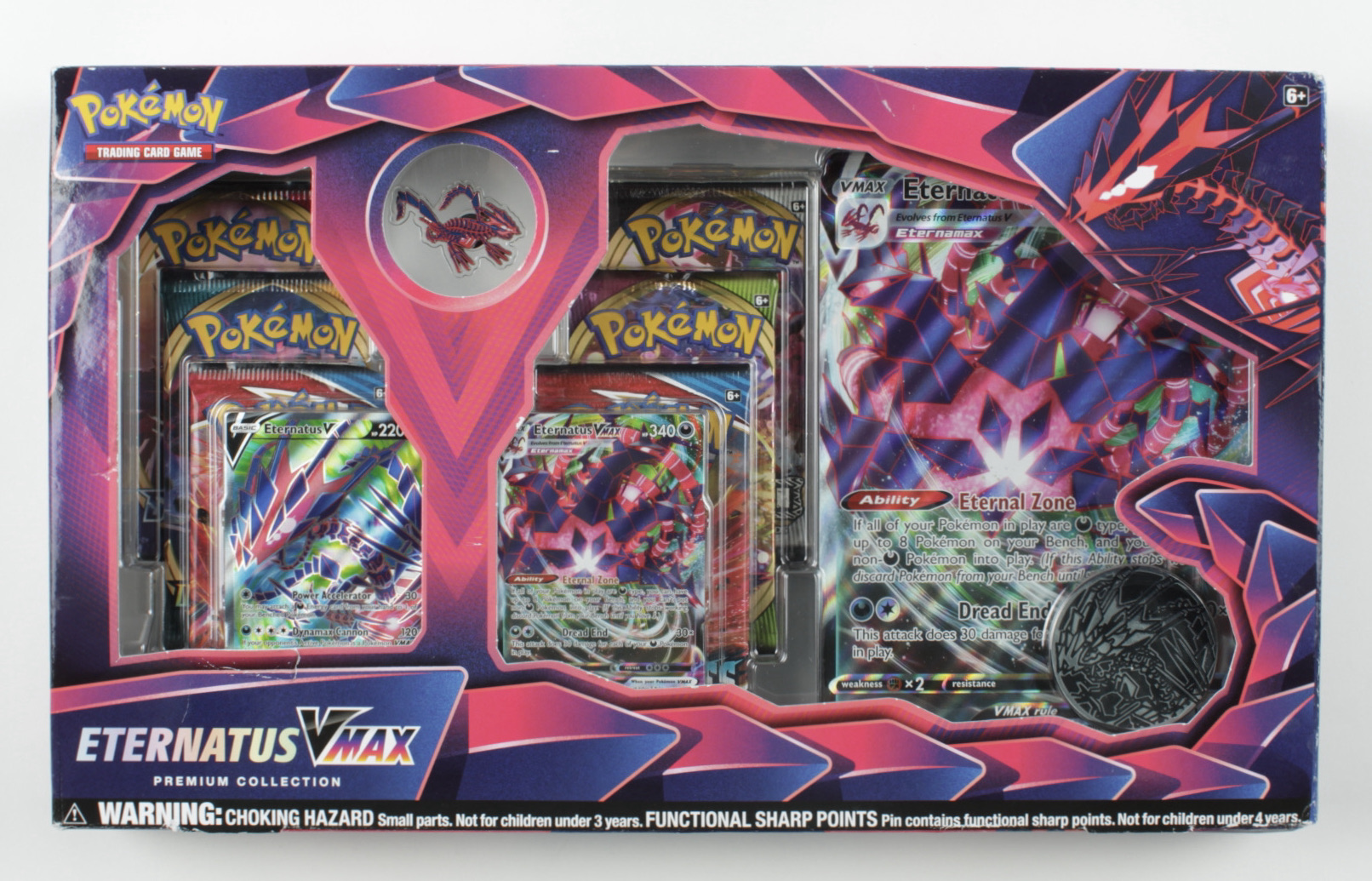Stories say the Legendary Pokémon Eternatus is the power behind the Dynamax phenomenon in the Galar region—and now all that power is contained in one place! This premium collection brings you both Eternatus V and Eternatus VMAX as playable foil cards, an oversize card that shows off this Legendary Pokémon in its unique Eternamax form, a collector’s pin, and a handful of Pokémon TCG booster packs to expand your collection.