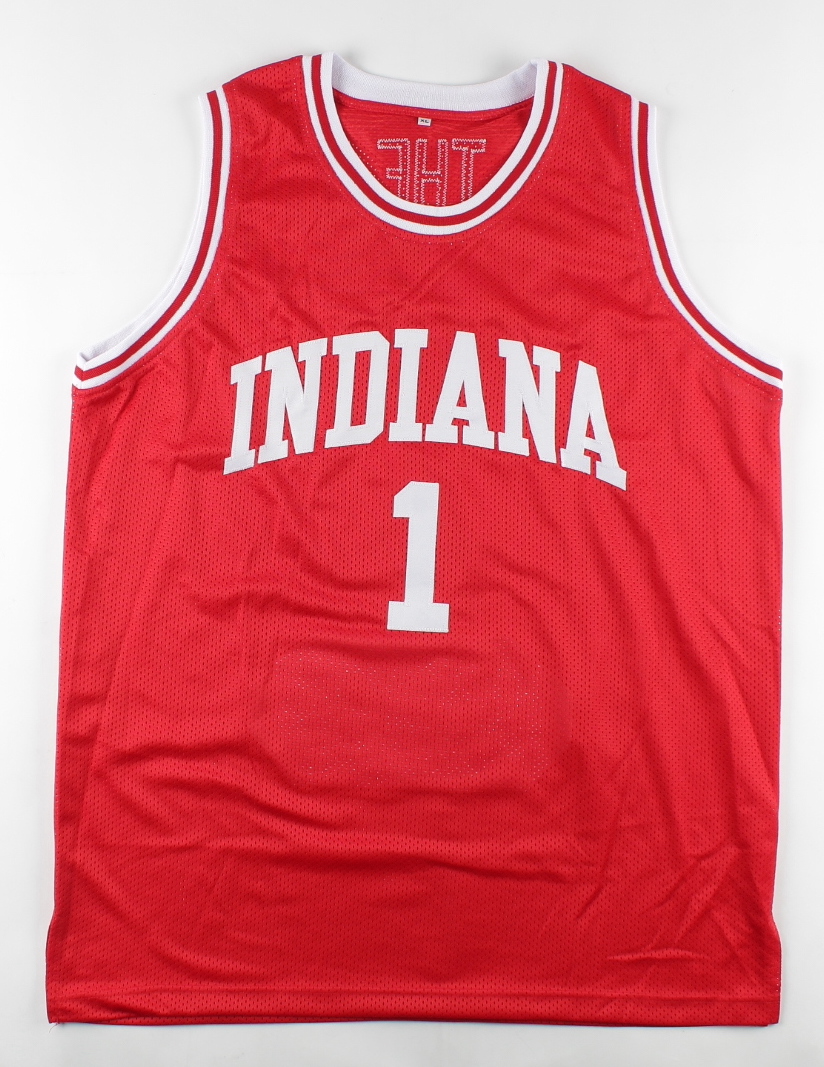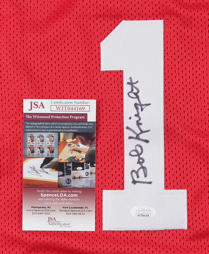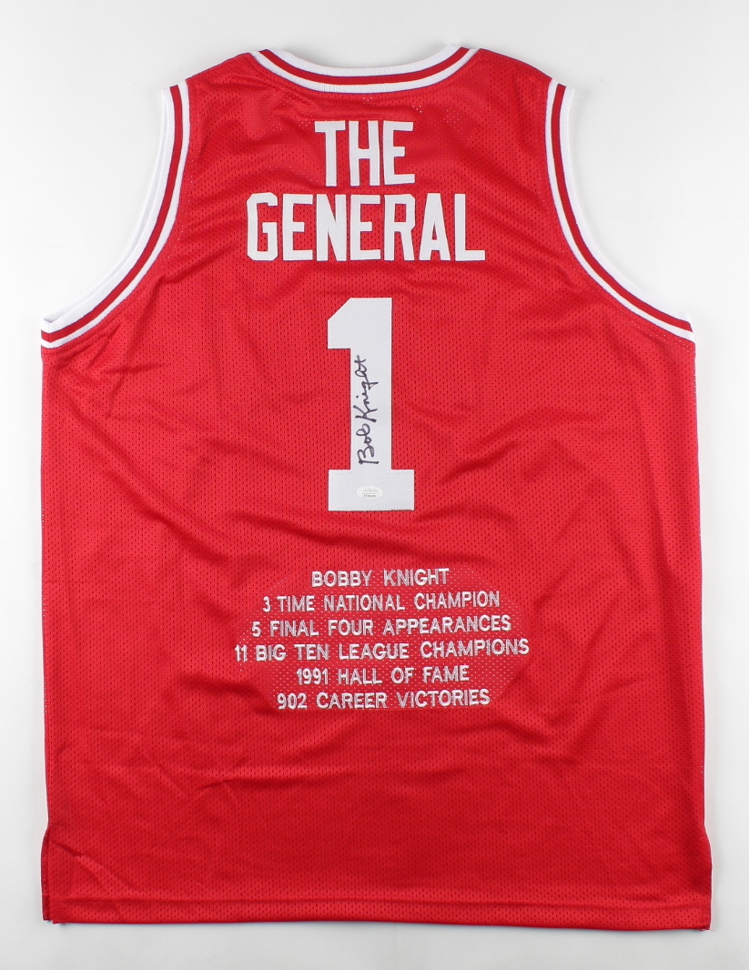 Custom on-court style jersey. Everything is sewn on, size XL. Hand-signed by Bob Knight (HOF). Knight's career highlights are custom stitched below the numbers on the reverse side of the jersey.