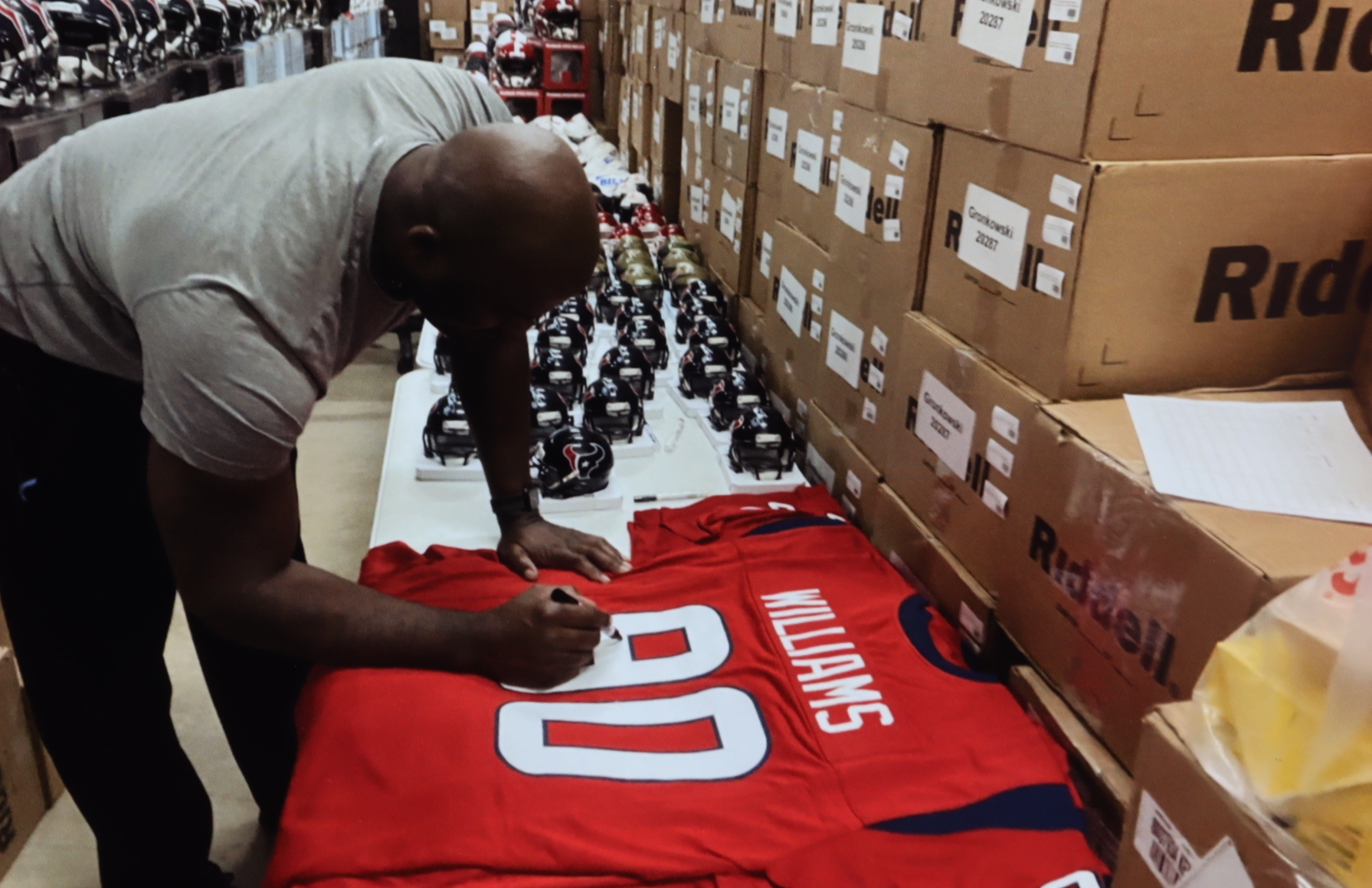 Custom on-field style jersey. Everything is sewn on, size XL. Hand-signed by Mario Williams.