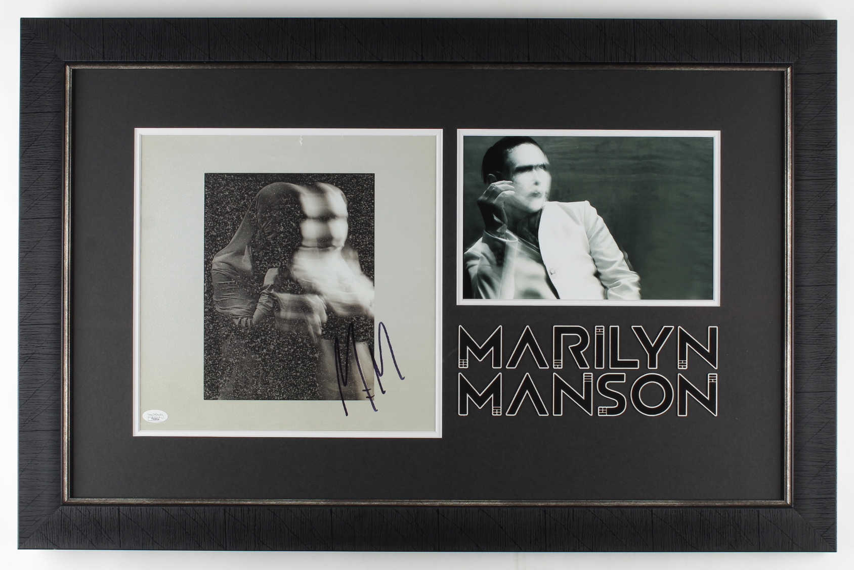 Custom framed display measures approximately 20" x 31" in size and features a photo that has been hand-signed by Marilyn Manson.