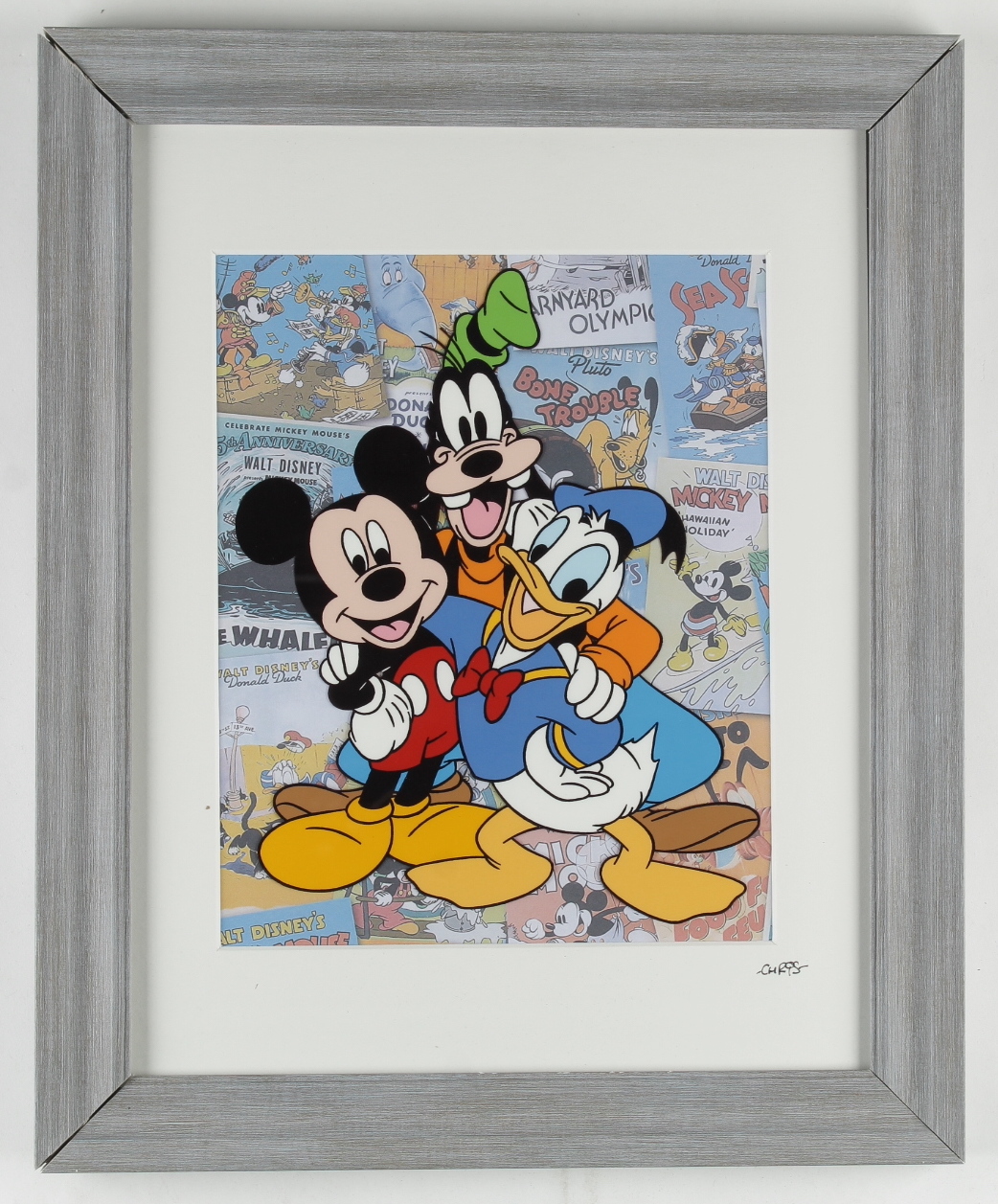 Custom frame measures approximately 13" x 16" in size and features a serigraph cel with Mickey Mouse, Donald and Goofy. Please note, damage to frame.