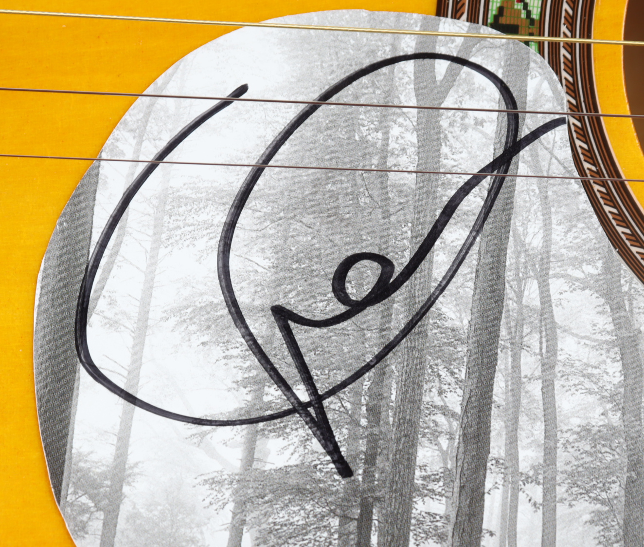Acoustic Guitar measures approximately 38" in length. Hand-signed by Taylor Swift on a CD cover and has been repurposed as a pick-guard. Please note, the guitar shows signs of wear.