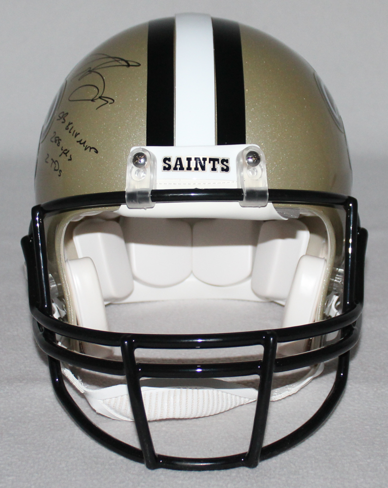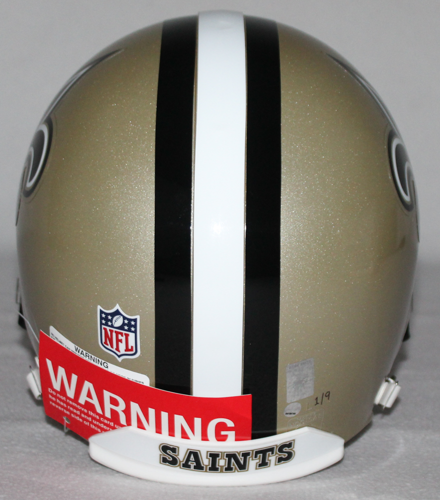 Riddell full size authentic proline helmet. Hand-signed and inscribed in black felt-tip pen by Drew Brees (Saints). Helmet is limited edition and has been hand-numbered #1/9.