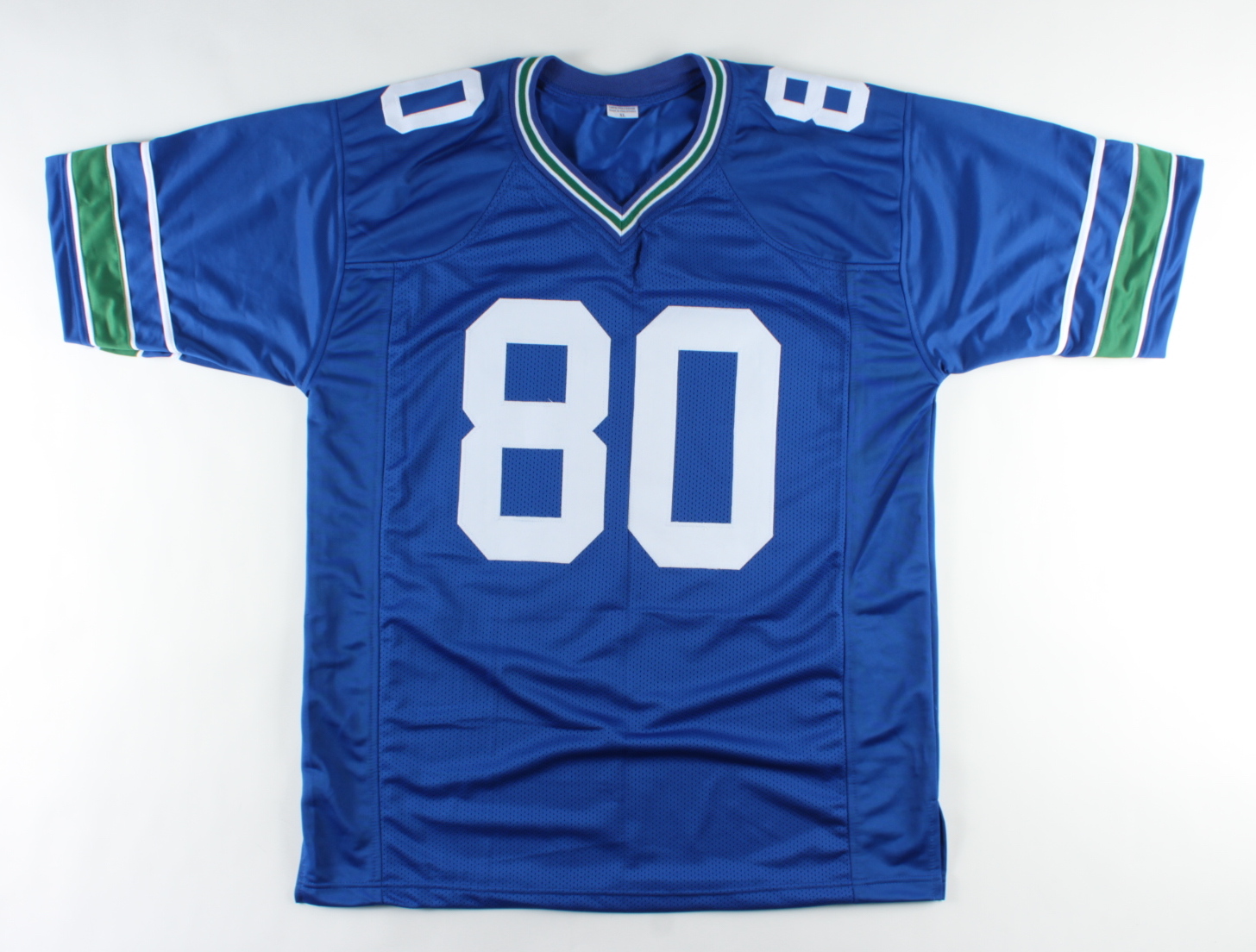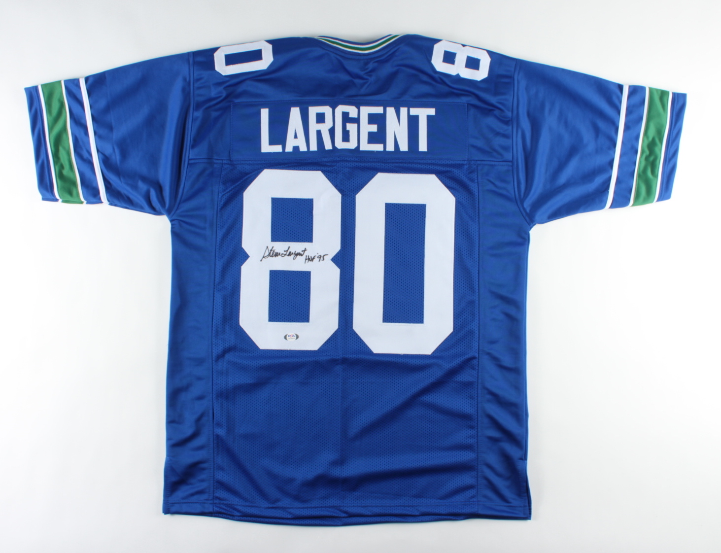 Custom on-field style jersey. Everything is sewn on, size XL. Hand-signed and inscribed by Steve Largent (HOF).