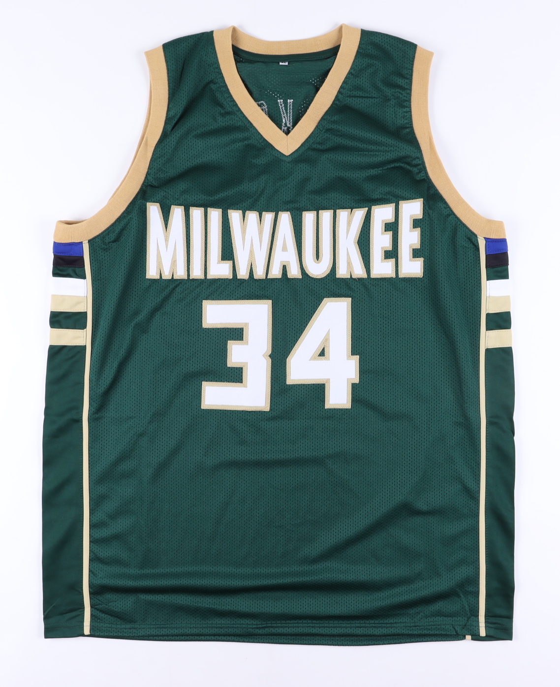 Custom on-court style jersey. Everything is sewn on, size XL. Hand-signed by Giannis Antetokounmpo. Please note, there is a stain on the left sleeve.