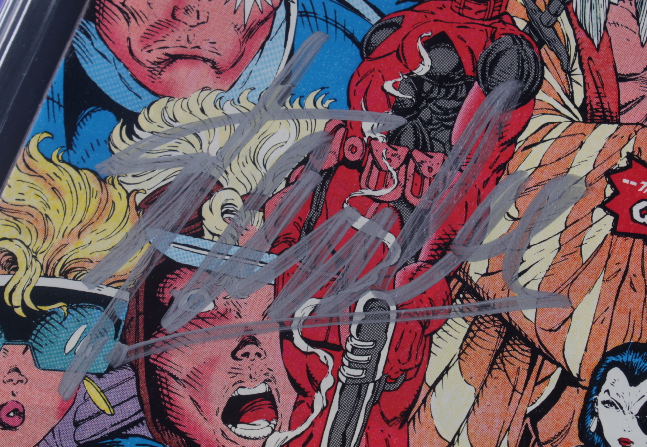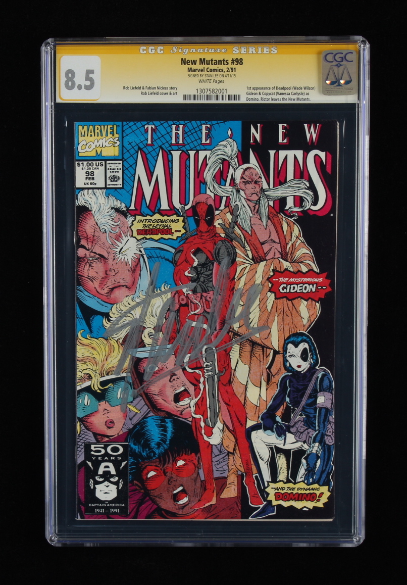 1991 "New Mutants" Issue #98 Marvel Comic Book. Has been hand-signed on the cover by comic writer Stan Lee (D. 2018). The comic book has been given a grade of (CGC) 8.5.